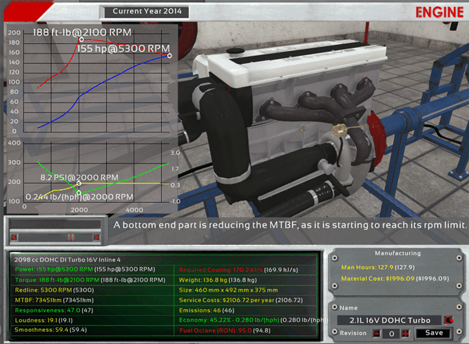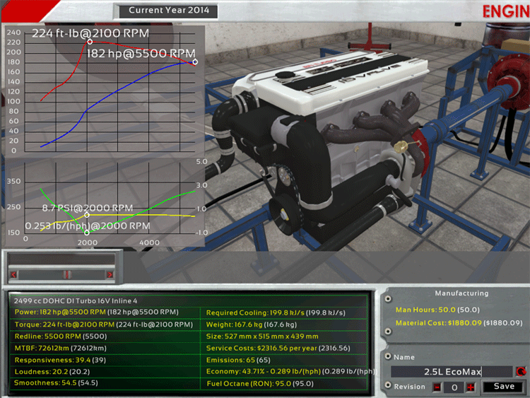 For a writeup that can be found on page 1 of my personal company thread, I also played around with economical engine formats. I found that an engine suitable for mass production in a budget car that was economical, balancing material costs, useable power and servicing costs, this format comes out to be the best balance of all those factors. Little surprise that it’s similar to the format used in FF hatches these days.