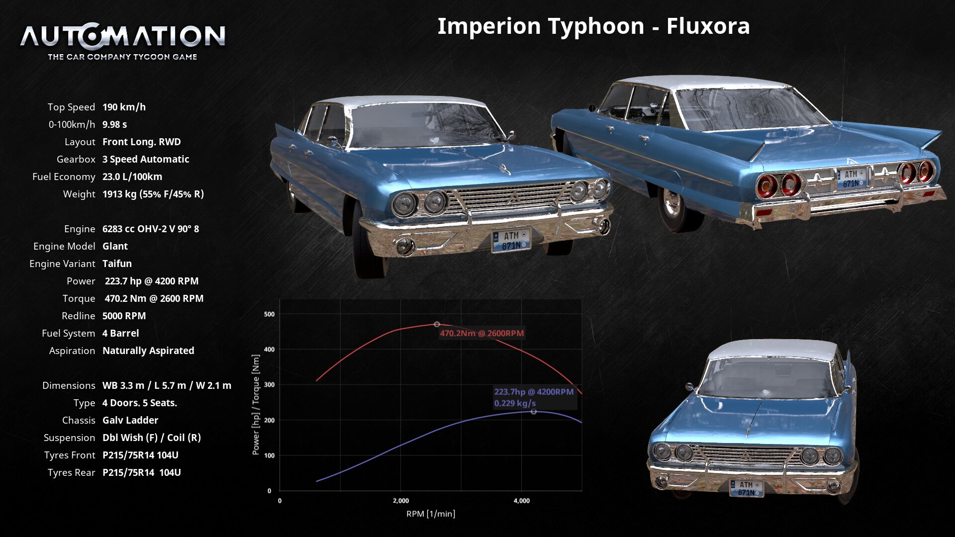 Although the I6 had so many great qualities, it became clear that many buyers at that time just loved the awesome V8 under the hood! To avoid the problems experienced by Hatson, who insisted on the inline six-cylinder engine, Imperion launched the incredible Typhoon Fluxora. This V8 model is based on the stunning 1960s body, marking a new era for Imperion. The 6.3-litre V8 engine was an absolute beast, delivering a mind-blowing amount of torque right from the get-go. It made driving a breeze, especially on those long journeys on the highway or on the turnpike. The Fluxora was positioned as the top trim above the Tempest, appealing to performance- and image-oriented customers and giving the brand the V8 presence that was practically considered a necessity of the luxury class in the US market.