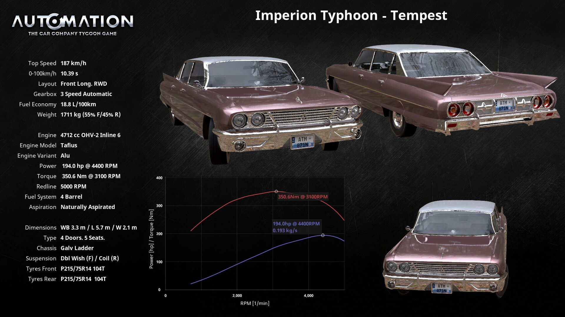 The Typhoon Tempest is the contemporary evolution of the classic line, presented by Imperion. The body was longer and more angular, with large glass surfaces and a clearer belt line, giving the car a much more modern look than the rounded Tornado of the 1950s. Under the hood, you’ll find a new, all-aluminum version of the 4.7-liter inline six-cylinder engine: the light-alloy engine reduced the weight on the front axle, improved agility and suspension comfort, and at the same time offered more power and better elasticity than the cast version. Combined with a three-speed automatic transmission, extensive noise insulation, and luxurious features, the Tempest was aimed at customers who valued refined long-distance qualities over striking performance figures.