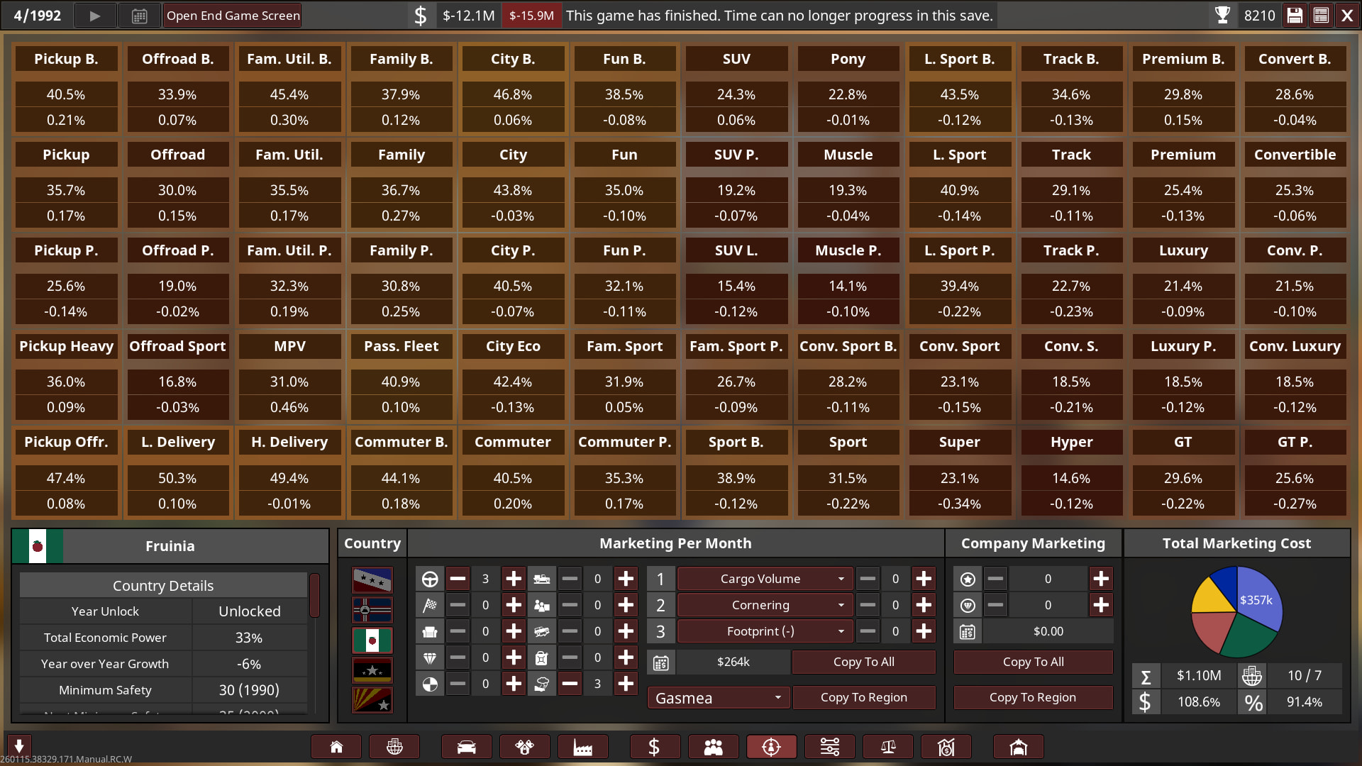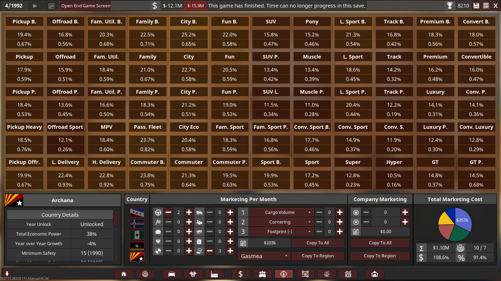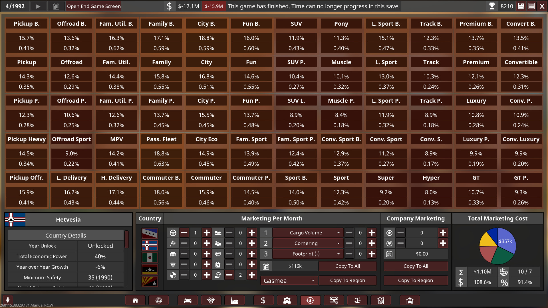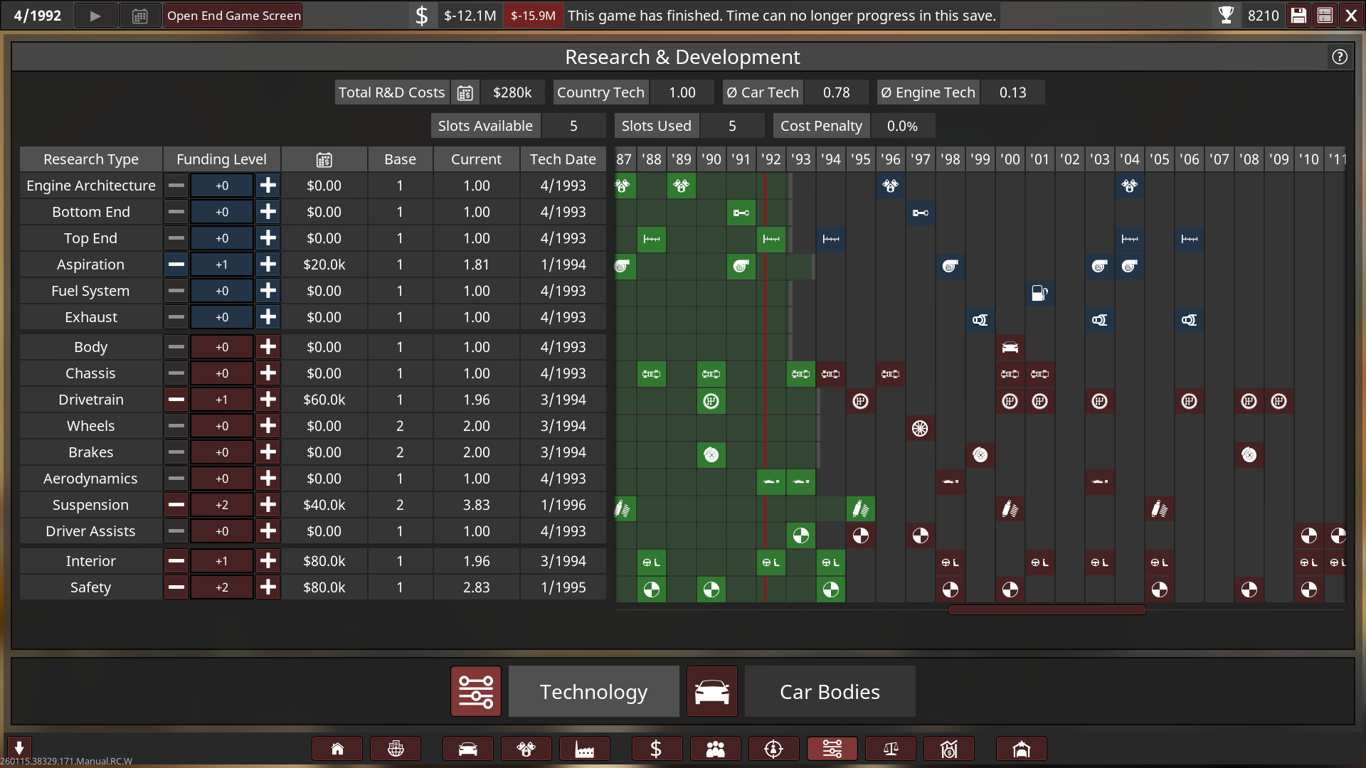 Unfortunately I went bankrupt in 1992 on the 1st campaign! So I will try again with a bit of an easier setting, turns out 2.2x was basically insane with a bit more money! I’m only a beginner at campaign so I need to keep learning and growing as I play it on an easier setup. Think of the 1st playthrough as more of an “alternative history” play.