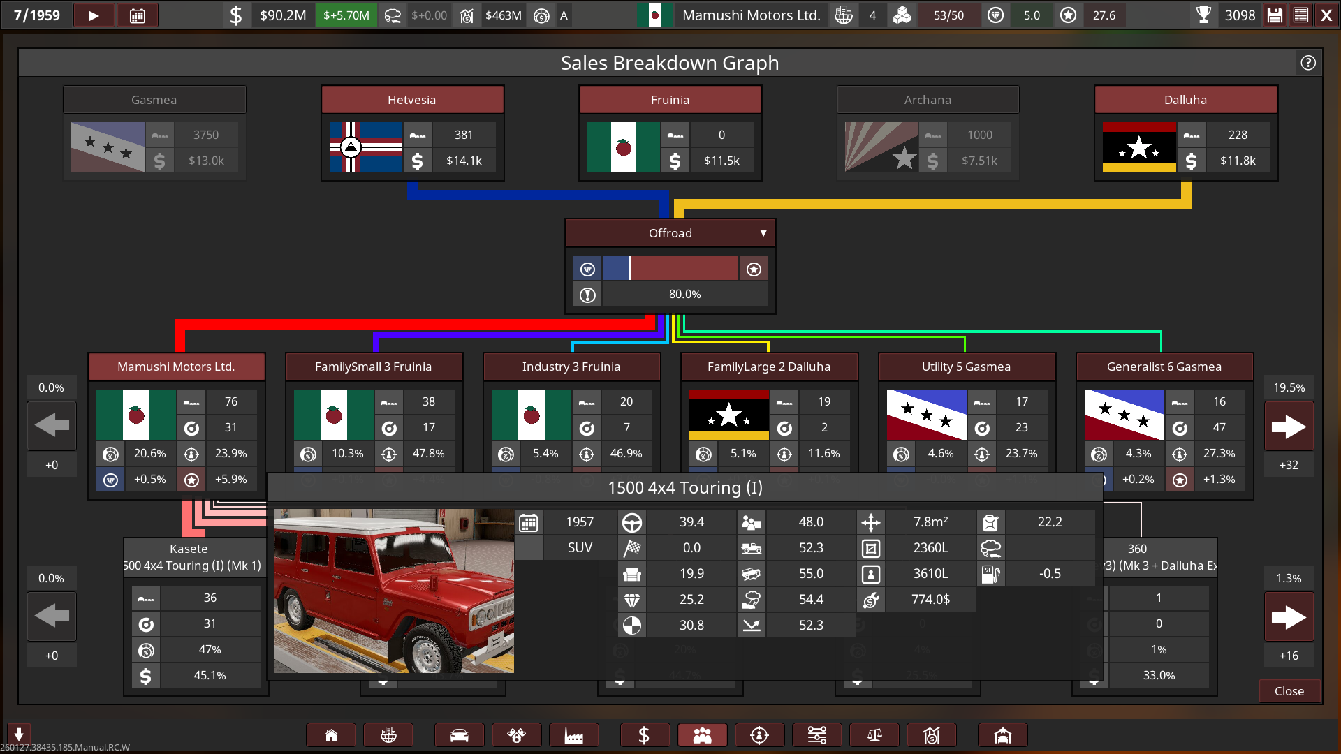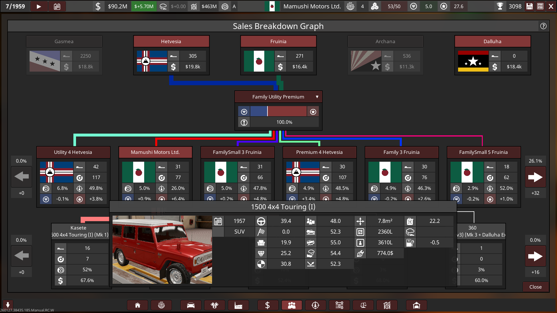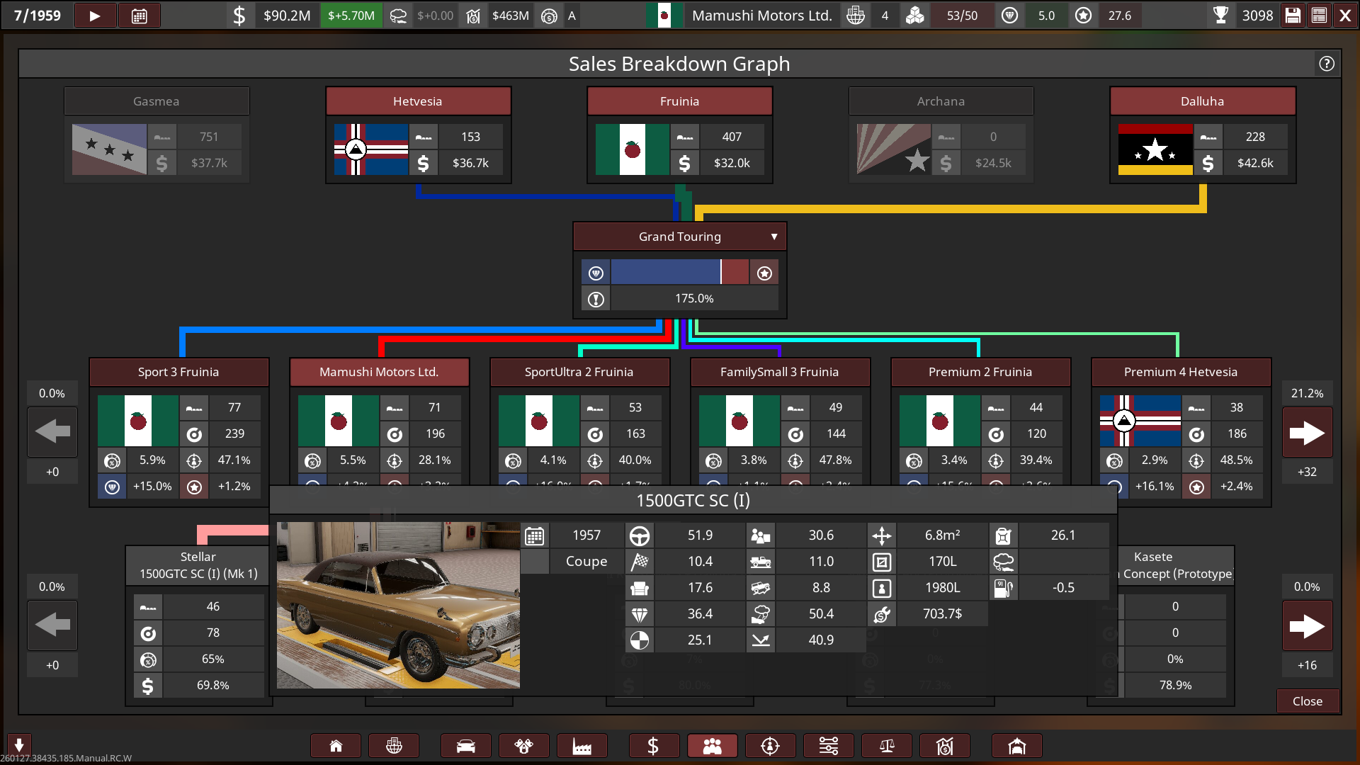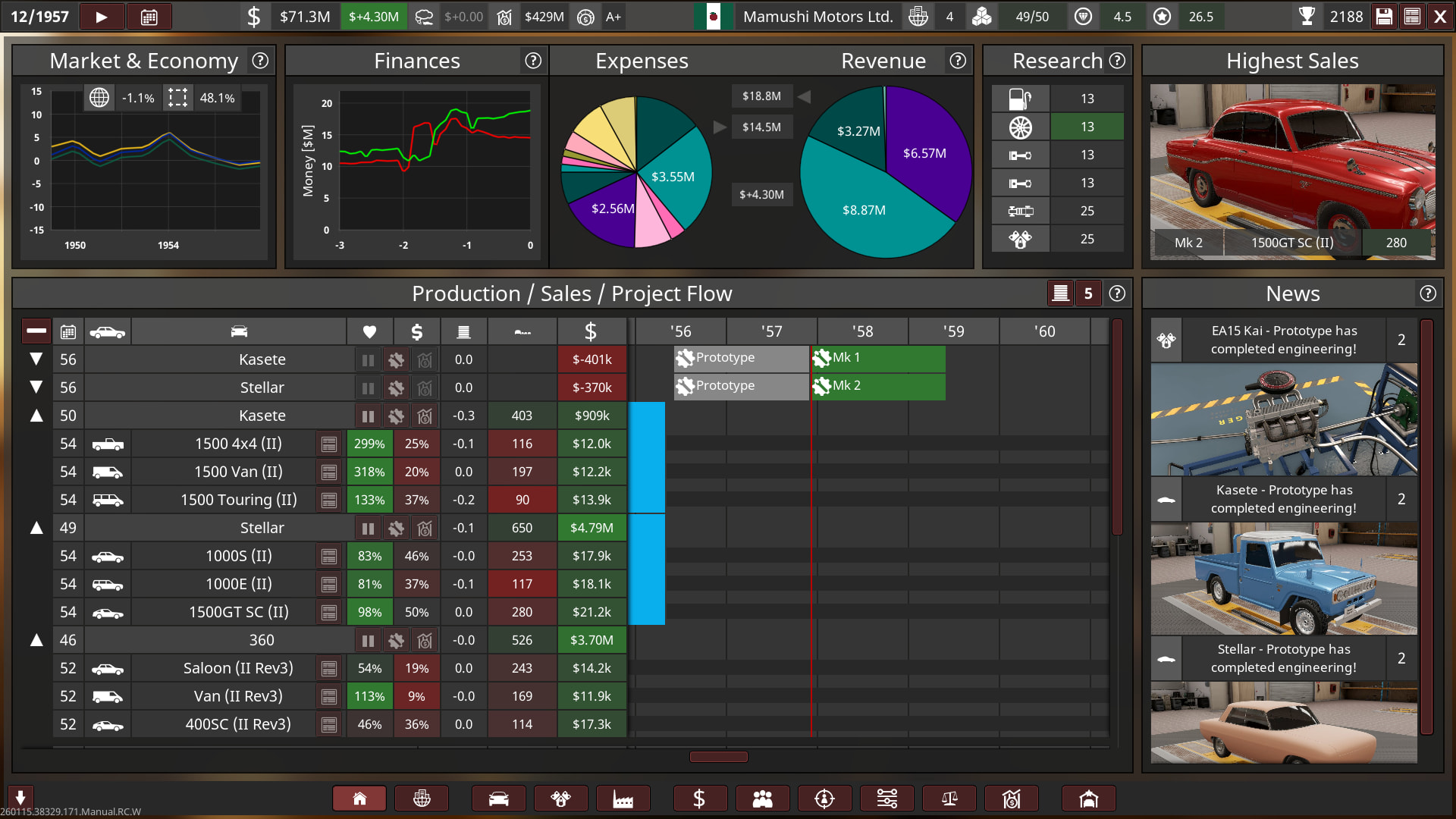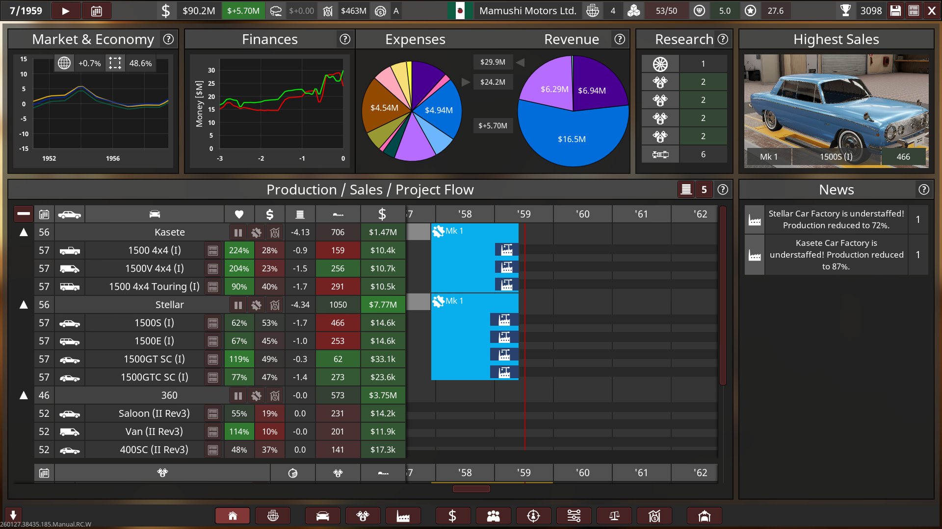 - Mamushi started out with huge sized lots and small factories, a lot of their production utilised the abundance of post-war aluminium. Innovation towards automation was held highly, and so most factories had less staff and more automated production with high quality tools & quality assurance, this helped Mamushi produce affordable and reliable cars to the public whilst being cost-effective, boosting their growth into the 60s.