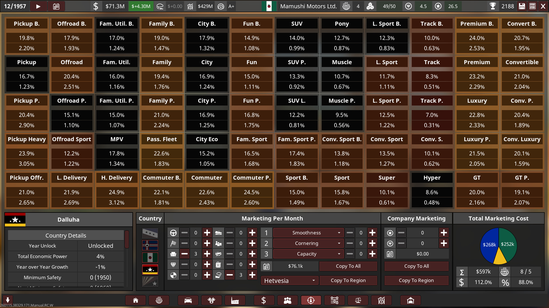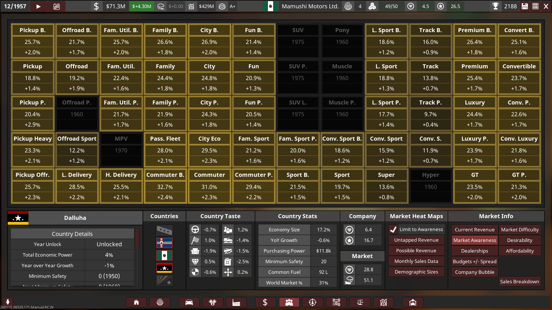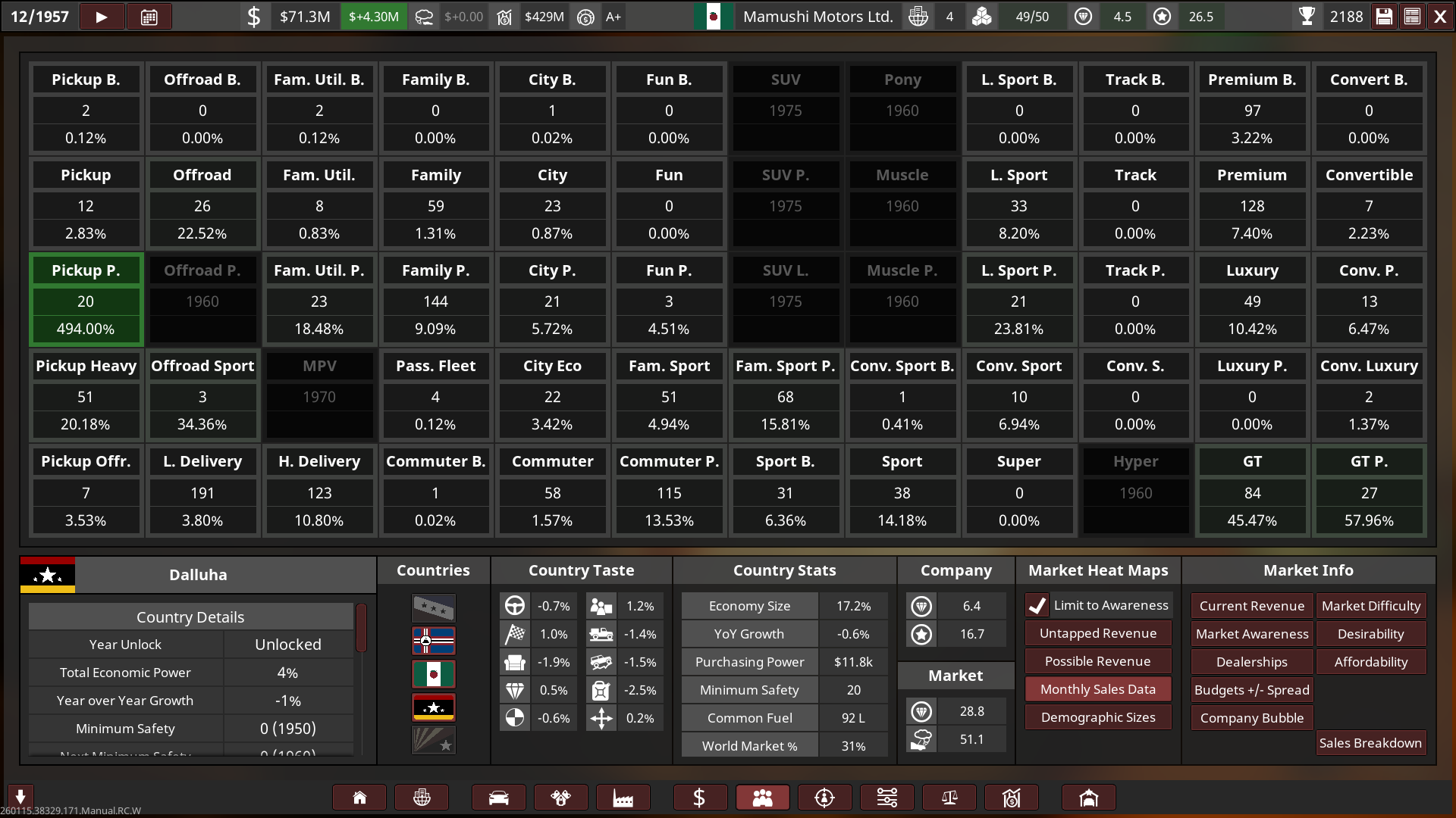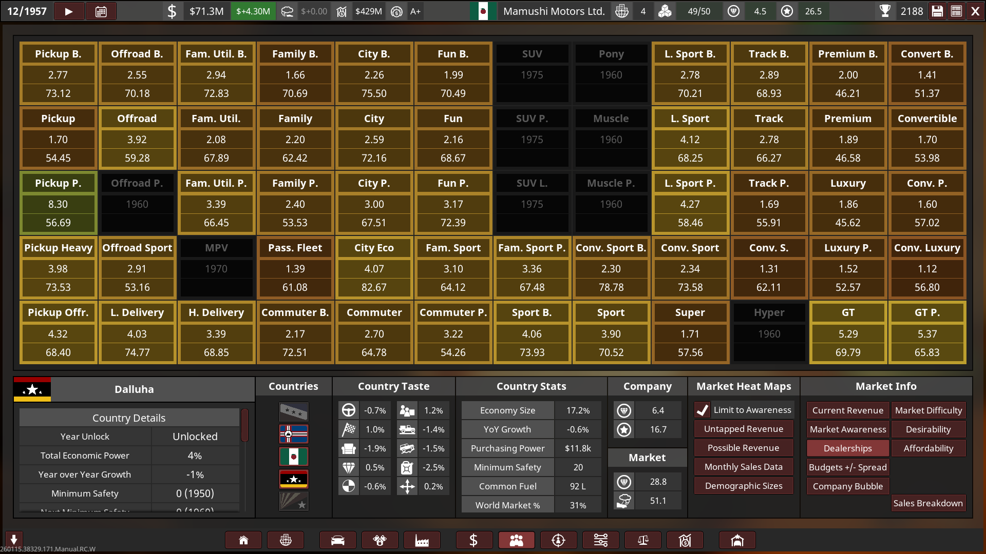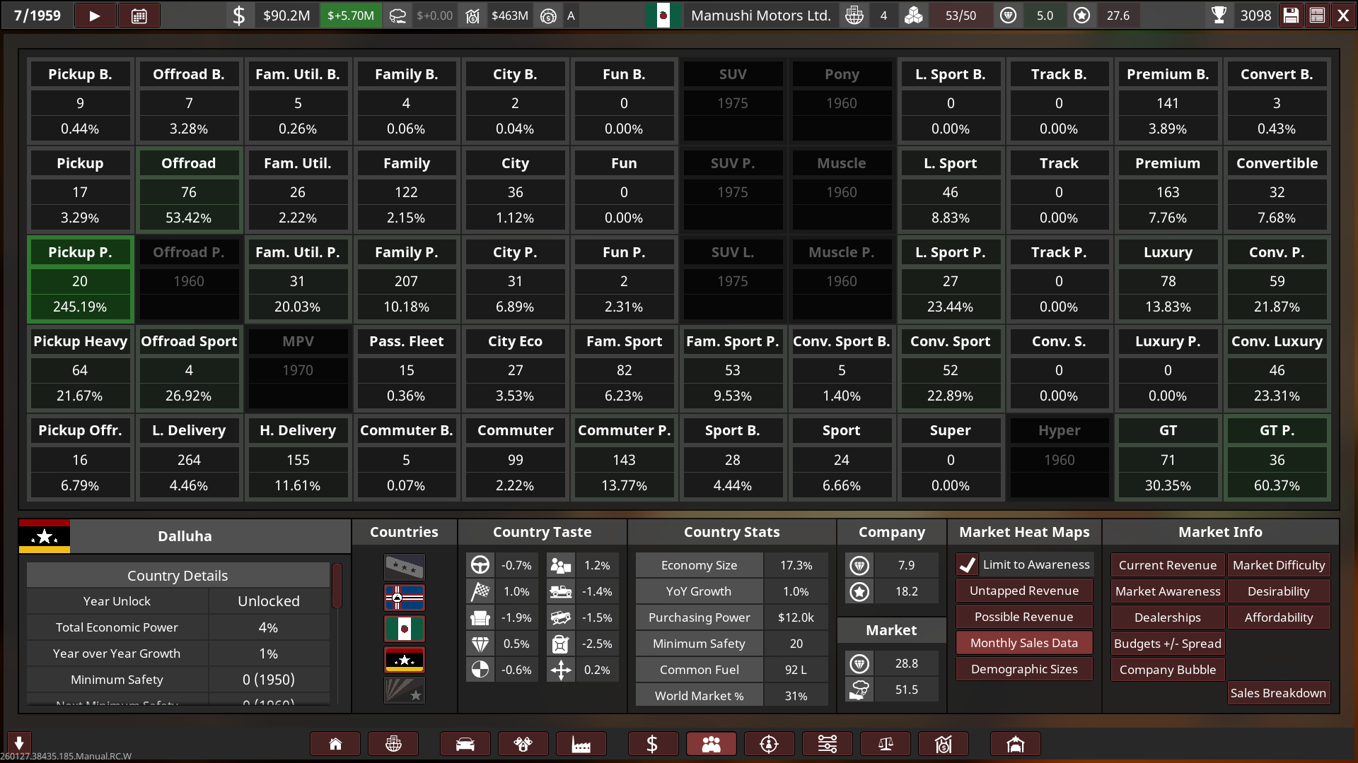- Mamushi started out with huge sized lots and small factories, a lot of their production utilised the abundance of post-war aluminium. Innovation towards automation was held highly, and so most factories had less staff and more automated production with high quality tools & quality assurance, this helped Mamushi produce affordable and reliable cars to the public whilst being cost-effective, boosting their growth into the 60s.