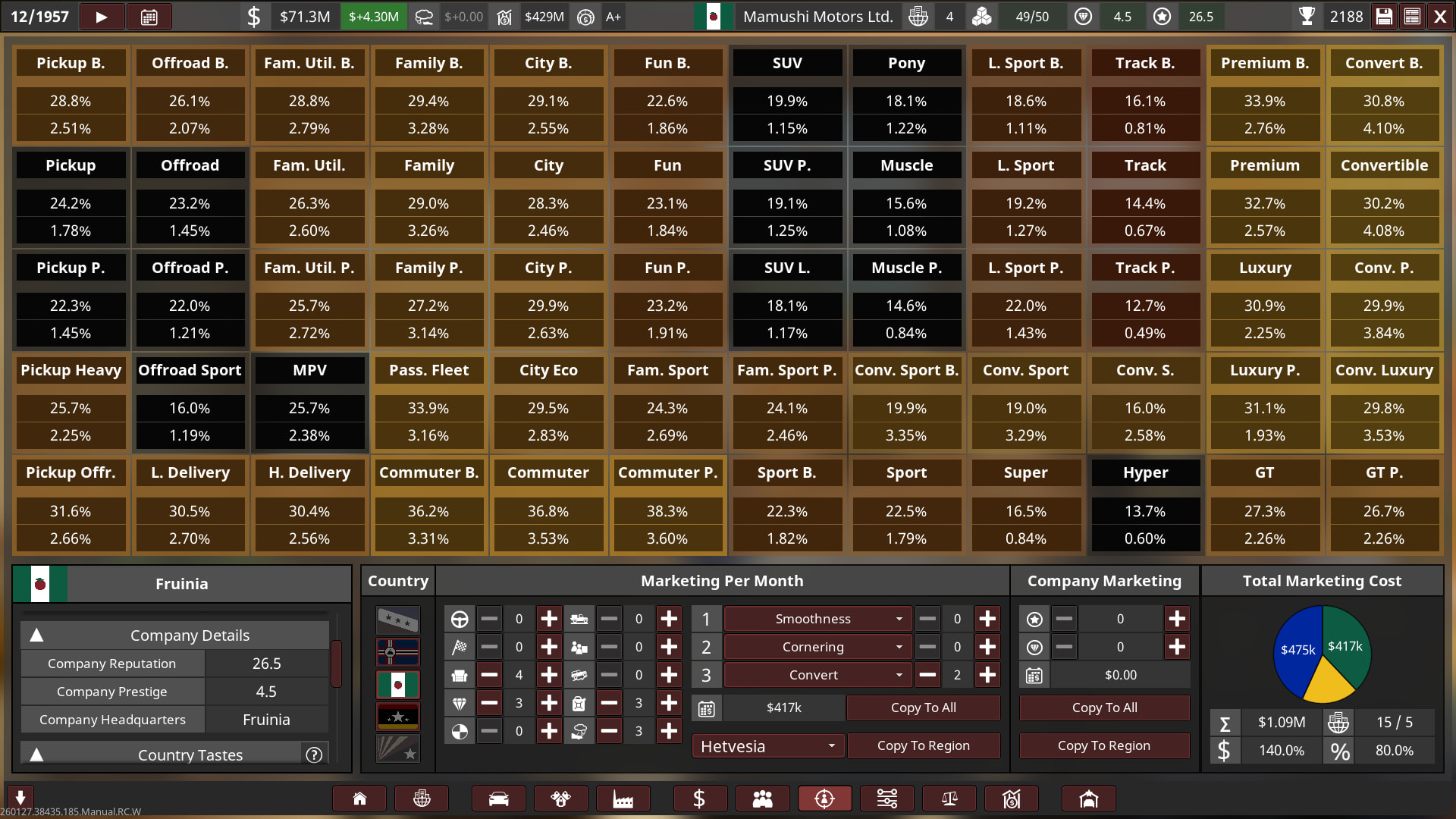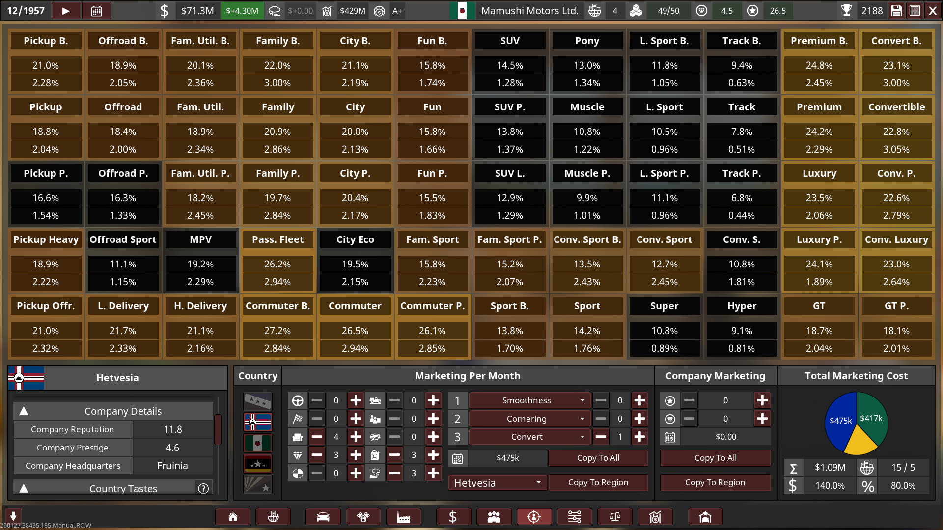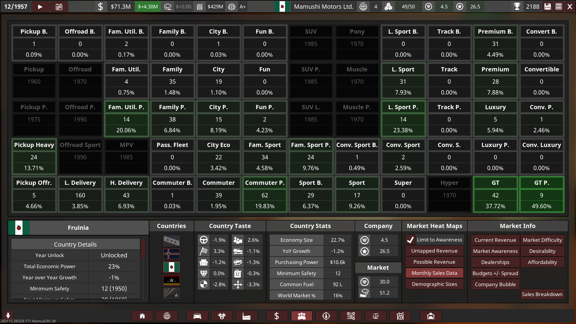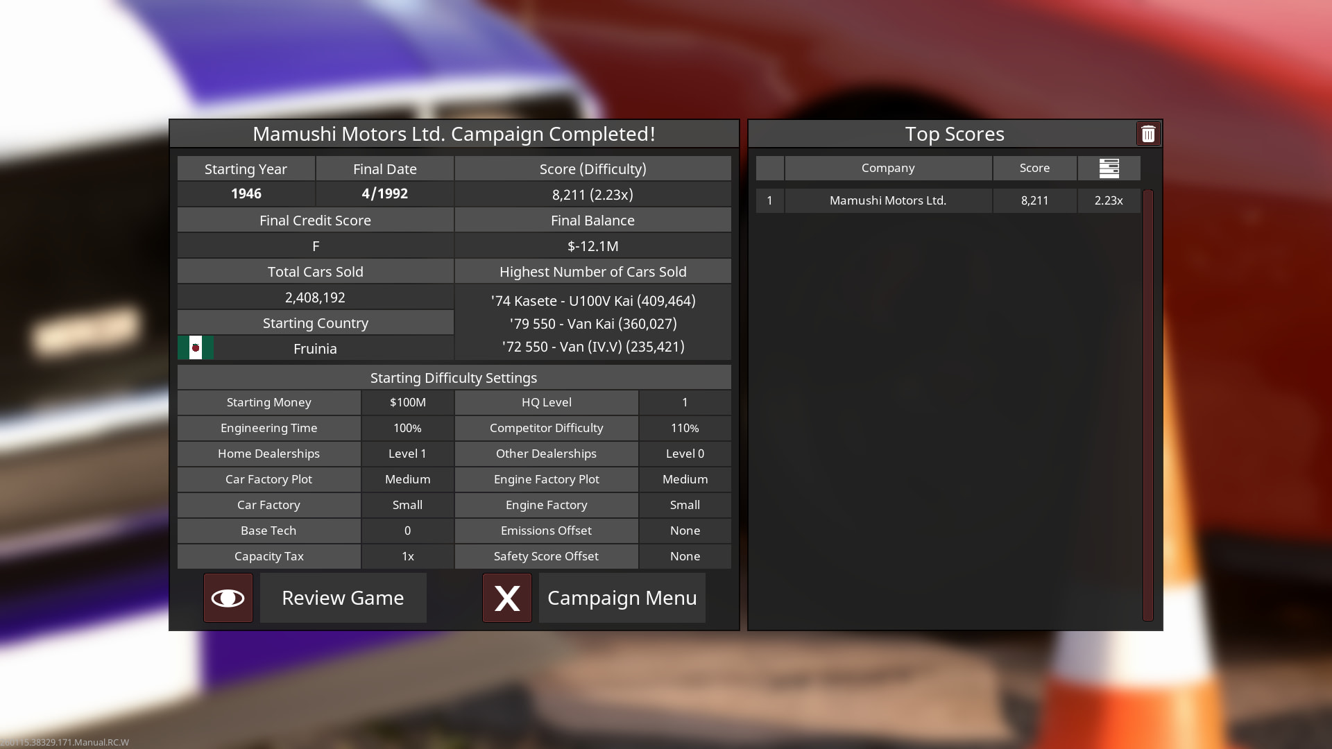 The settings I used for the 1st playthrough are as follows: 100m starting money, HQ Level 1, Engineering Time 100%, Competitor Difficulty 110%, Market Desires at 65, Market Volatility at High, Home Dealerships Level 1, Other Dealerships Level 0, Car & Engine Factory Plots Medium with Small Factories on both, Base Tech of 0, Emissions Regulations Realistic, Safety Regulations Standard, and finally Capacity Tax 1x, giving a score multiplier of 2.23x.