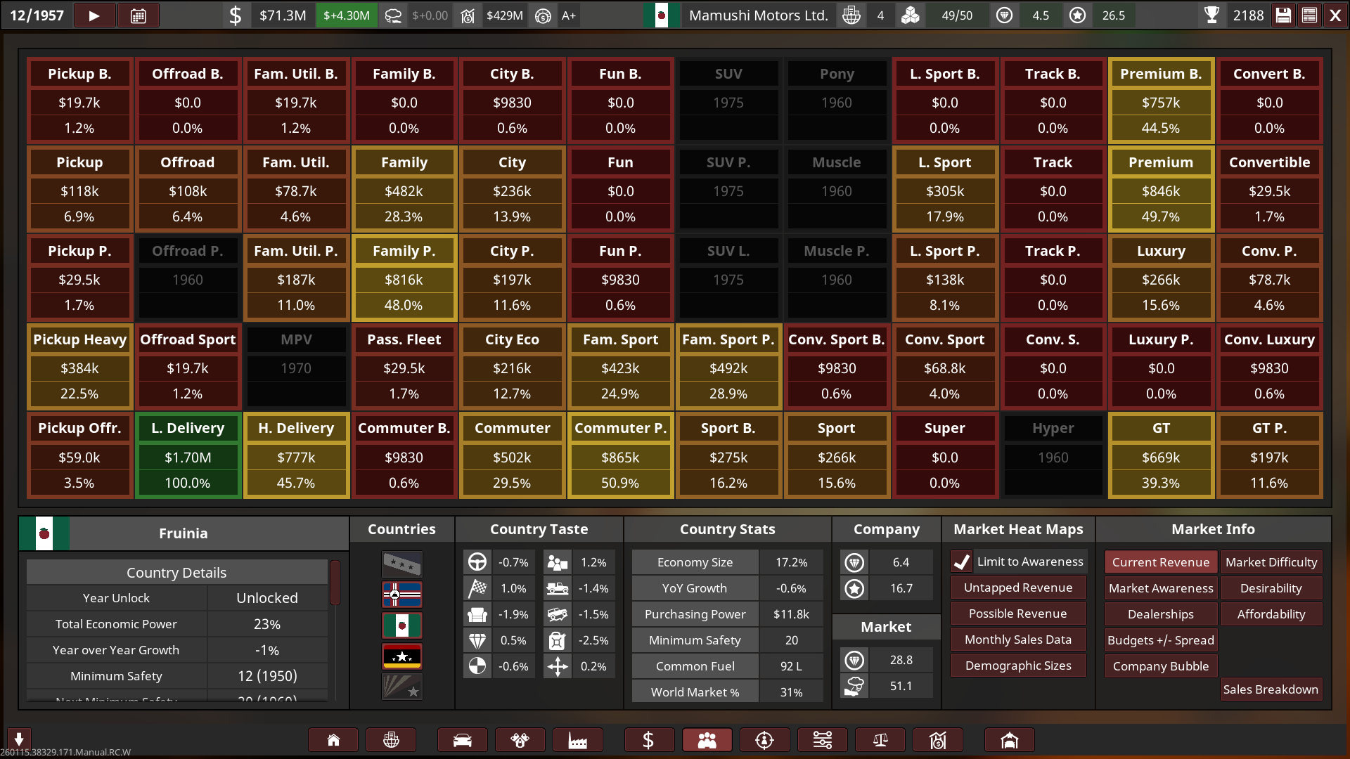 With the economy in shambles and most companies creating trucks to help build back up the nation, restrictions on passenger vehicles was imposed, and so Mamushi Motors started out by creating limited production kei cars with the focus to becoming the top manufacturer in Japan for affordable and reliable cars. The company was also offered contracts to design and create trucks and military vehicles, which it took on alongside passenger car production to help sustain the brand’s income as well as keep it open to expansion into different markets.