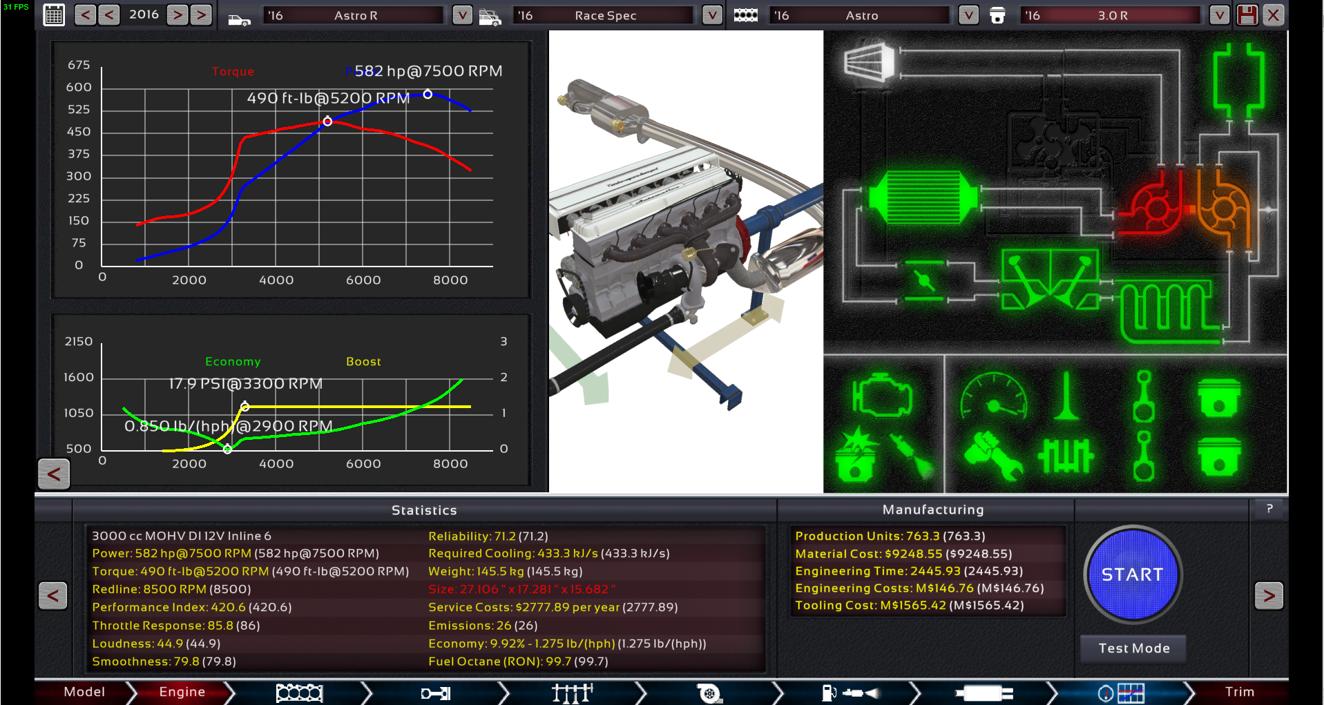 The engine is an undersquare 3000cc turbocharged inline-6 mounted longitudinally. You might be surprised that such an engine actually fits in a hatchback (trust me, I am too), however there was a slight issue with space in that I could not use any sort of OHC valvetrain because the engine would be too tall. Because of this, I ended up using modern OHV. Had we been able to use DOHC as planned, I reckon the car would have performed even better. The problem with the current MOHV is that I’m not able to fully control the torque curve, so the car ends up having a huge amount of wheelspin because of the huge wall of torque. Note: This is the race variant of the Astro. The regular production version shall be revealed later on.