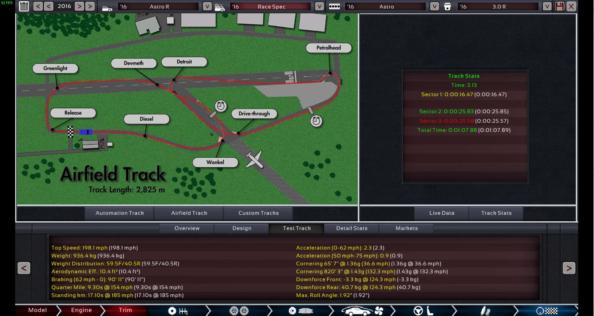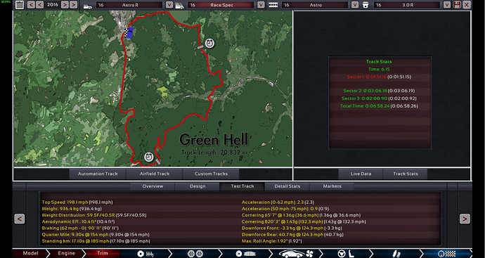 [size=200]T[/size]he Astro R is the fastest car that I’ve ever built when it comes to track times. It is a whole 14 seconds faster around Green Hell than the Hypernova, and it is also roughly 3 seconds faster around the Airfield than the Hypernova. However, the Astro R is a full race car and not a production car (the $700k price tag might have something to do with that) unlike the Hypernova, so it is a little unfair to compare the two.