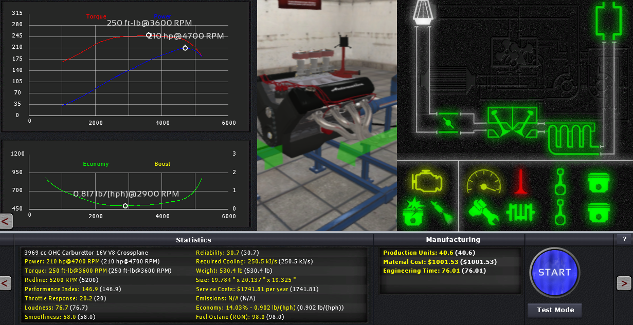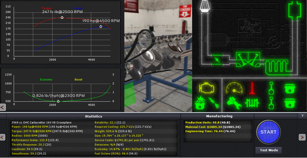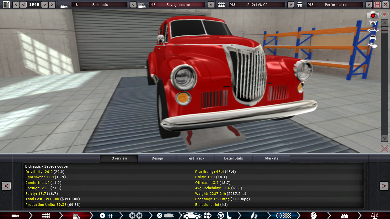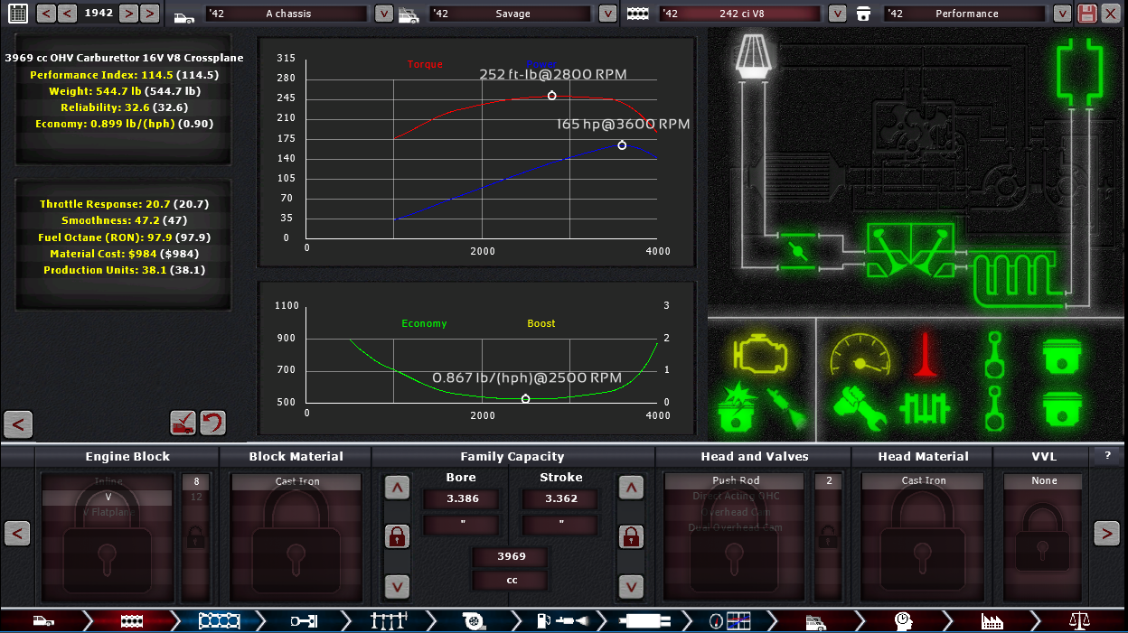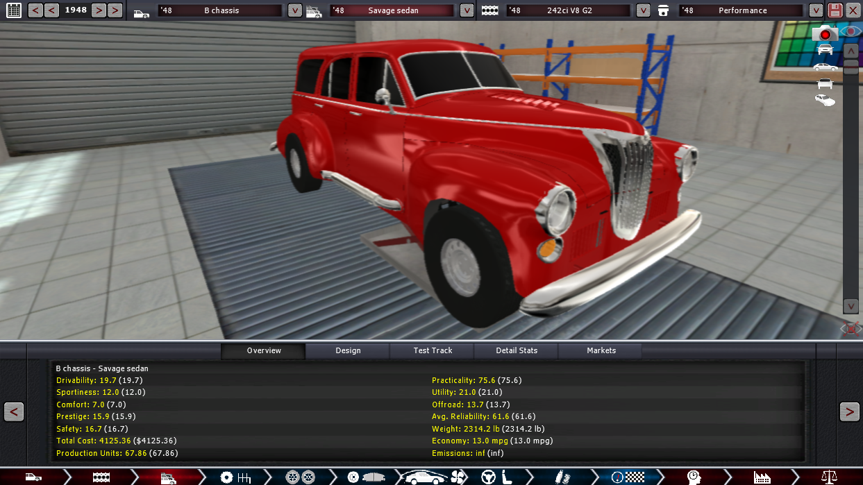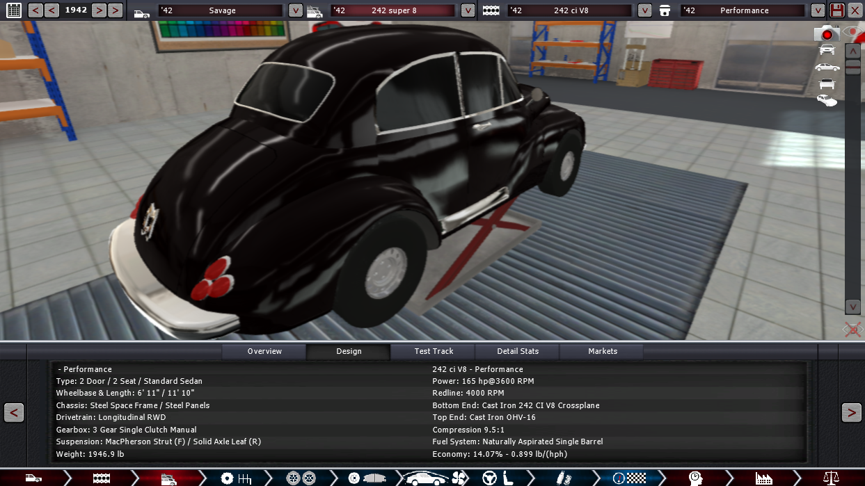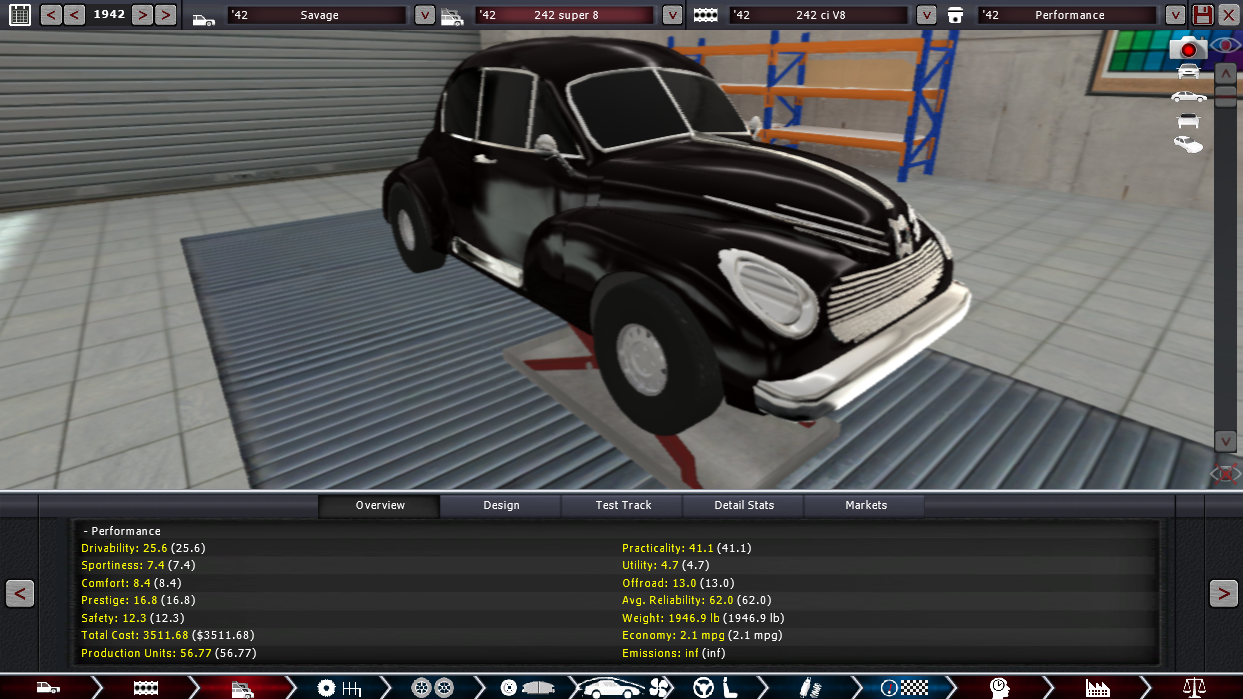The savage was designed to be a production Hot Rod readily available to the public. It cost $3390 at the time ($9106@20% markup in game) For that price you got a 242ci V8 engine that developed 165hp and 252lb-ft of torque. It was capable of reaching 60mph in 9.5 seconds and get up to a top speed of 131mph with the 3 speed transmission it used making it the fastest production car of the time. Tires were made of high quality rubber to allow for increased width and more grip to keep the wheelspin at bay. There were thoughts of using overhead cams on the engine but the increased power was too much for the tires and so pushrods were used instead.