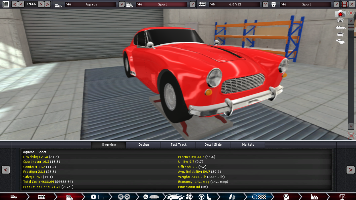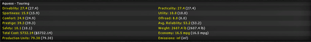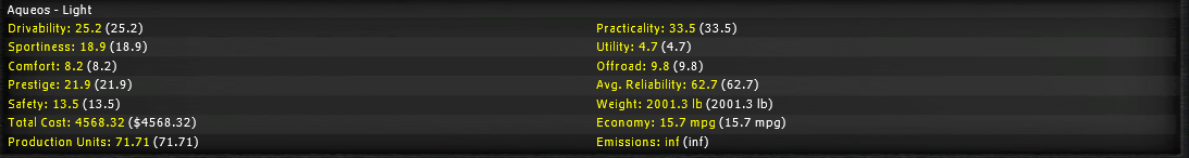 The aqueos was purely designed to be fast. Powered by a monstrous 6L V12 that made 275hp and 359lb-ft of torque. This power is put through a 4 speed manual transmission to high quality tires, once again to reduce wheelspin. The body is made of aluminum to reduce weight, making the car faster and the suspension was double wishbone front and rear to increase traction and cornering ability. Everything else about the car remained pretty standard for things like the interior, in part to reduce weight. It certainly did achieve its goal doing 0-60 in 7.3 seconds and reaching a top speed of 139mph and pulling .9 and .88gs allowing it to lap the airfield test track in 1:33.0. This performance did come at a decent price of $4388 ($13409@20% in game)