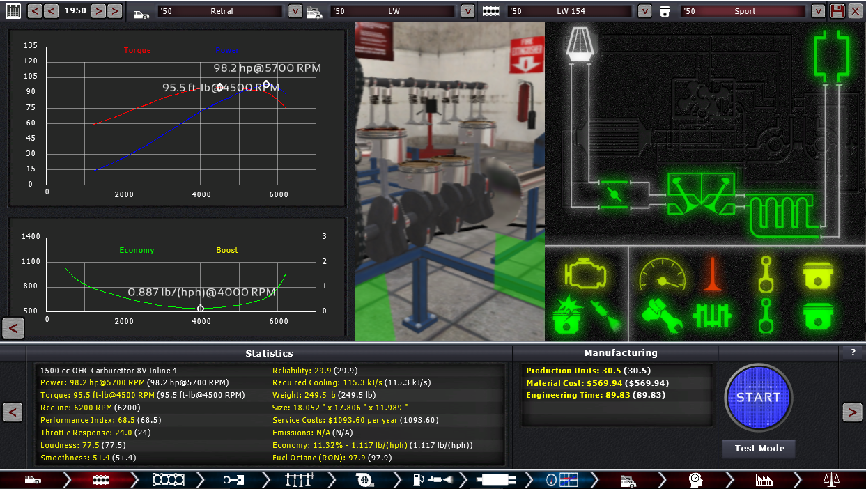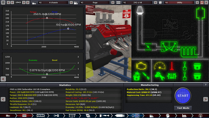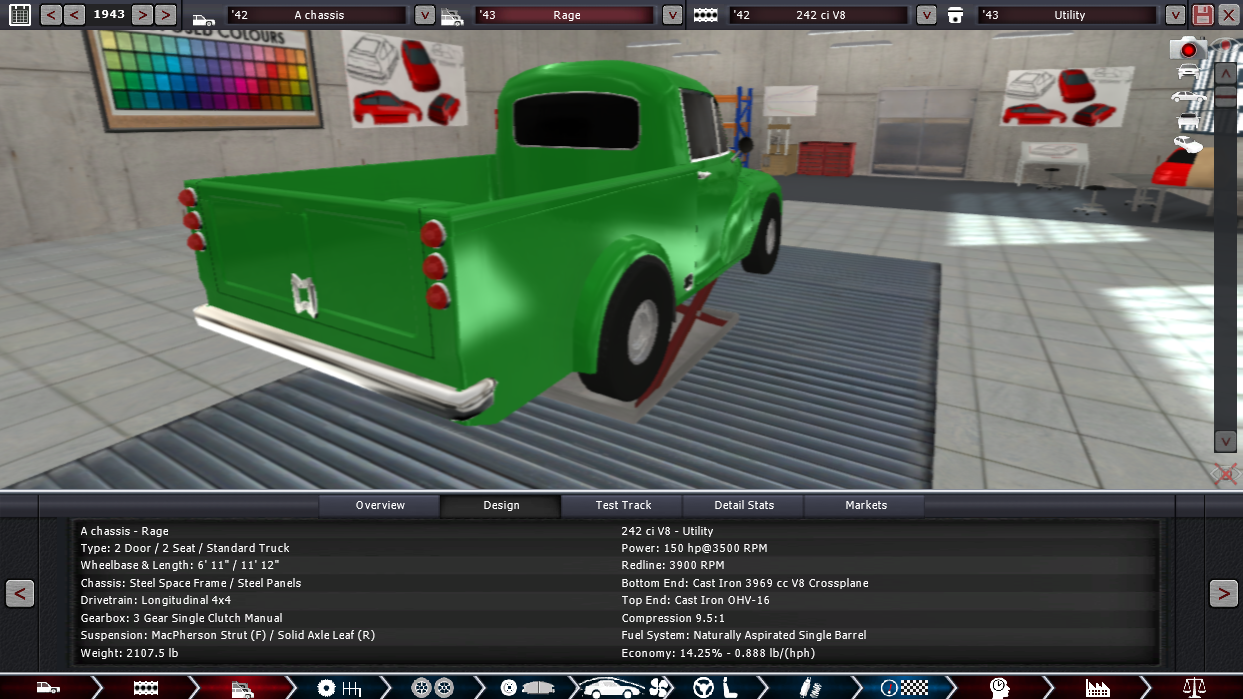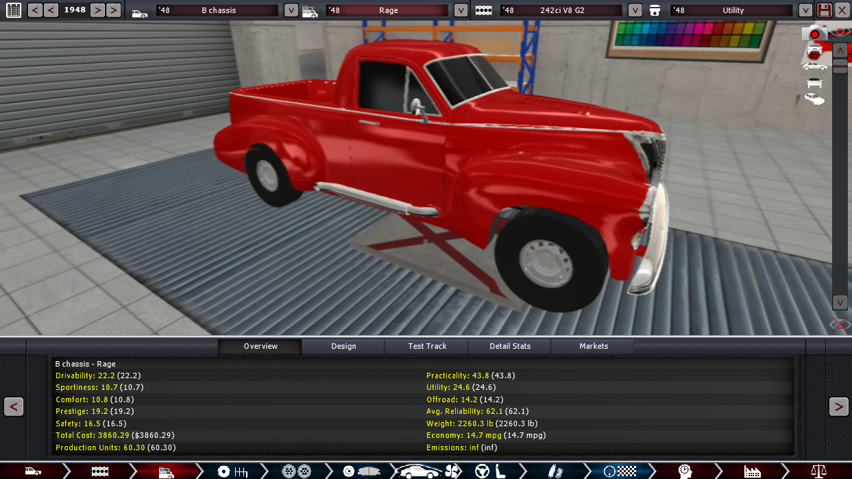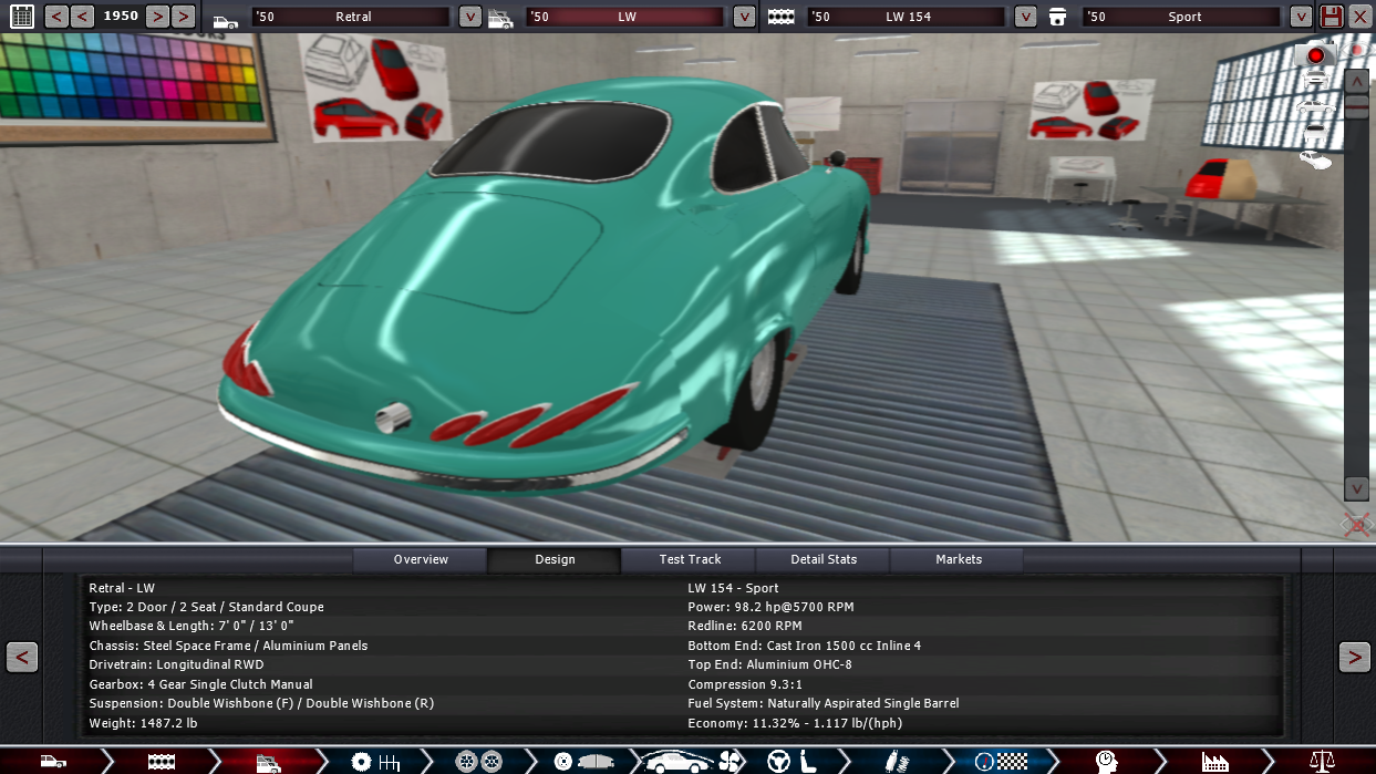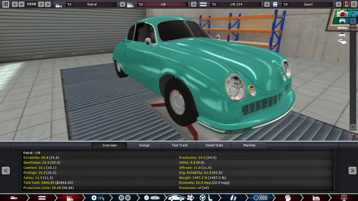The car itself featured double wishbone suspension all round and got power from the LW 154 engine, through a 4 speed manual transmission, through the rear wheels with very limited wheelspin thanks to the placement of the engine allowing for extra traction. The handling of this car was extremely good thanks to the low weight of just 1500lbs as well as a fine tuned suspension setup that made the car very agile allowing it to pull up to .87g in corners. Braking was one of the best of all Mott Works vehicles due to low weight and the rearward weight bias which meant that the drum brakes could apply nearly as much force as was possible with the tires. The cost for the Retral is $2452 ($9665@30%).