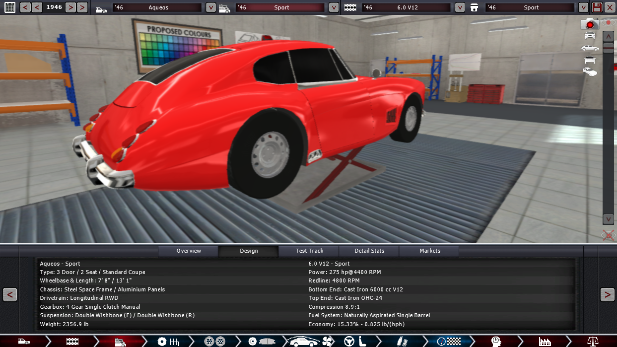 There were also 2 other trims of the aqueos available, the touring and light versions. The touring version featured a convertable roof and a more luxurious and comfortable interior as well as a de-tuned version of the V12 paired to a 3 speed manual to make the car easier to drive. This car was available for $5290 ($16173@25% in game)