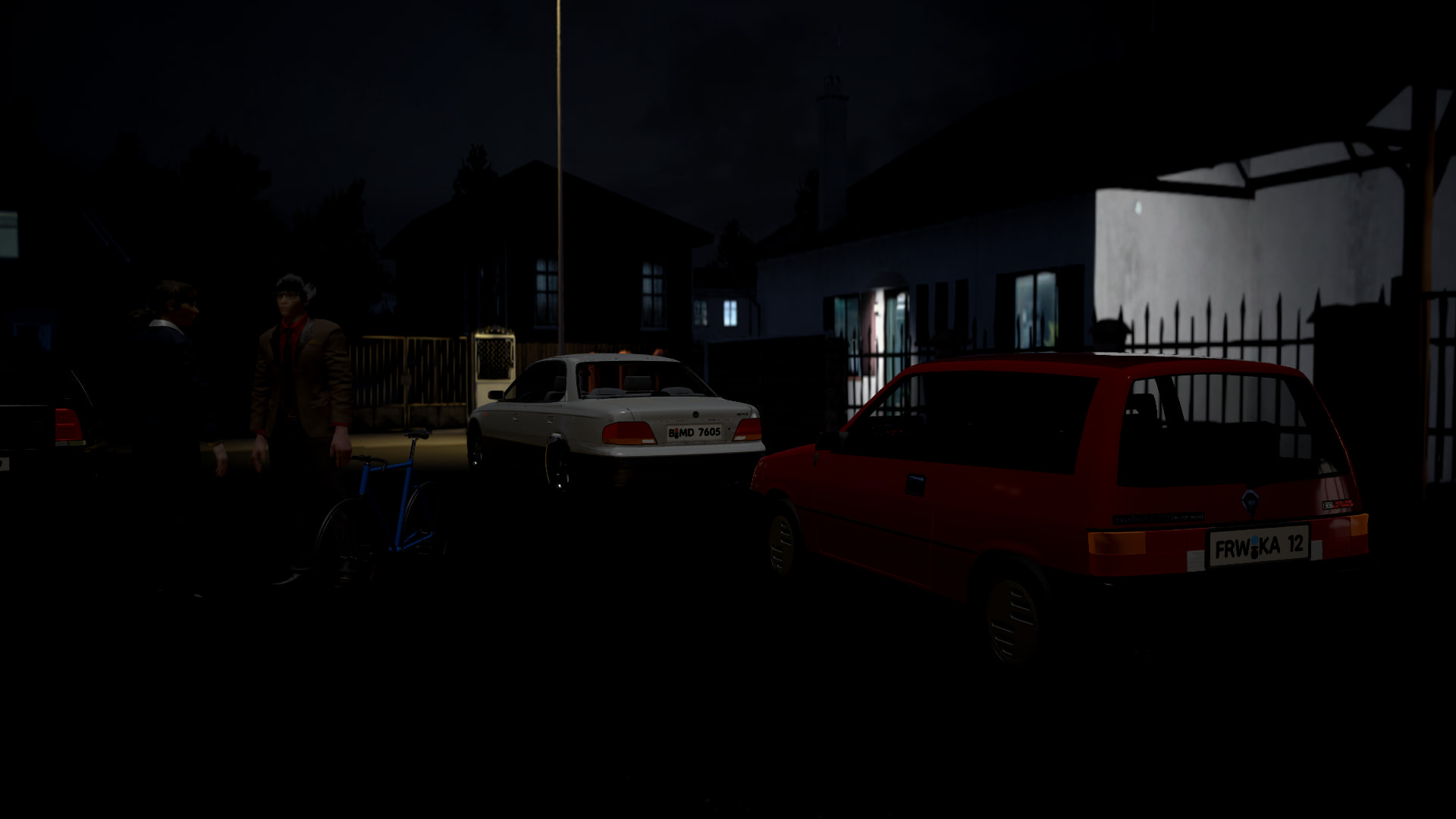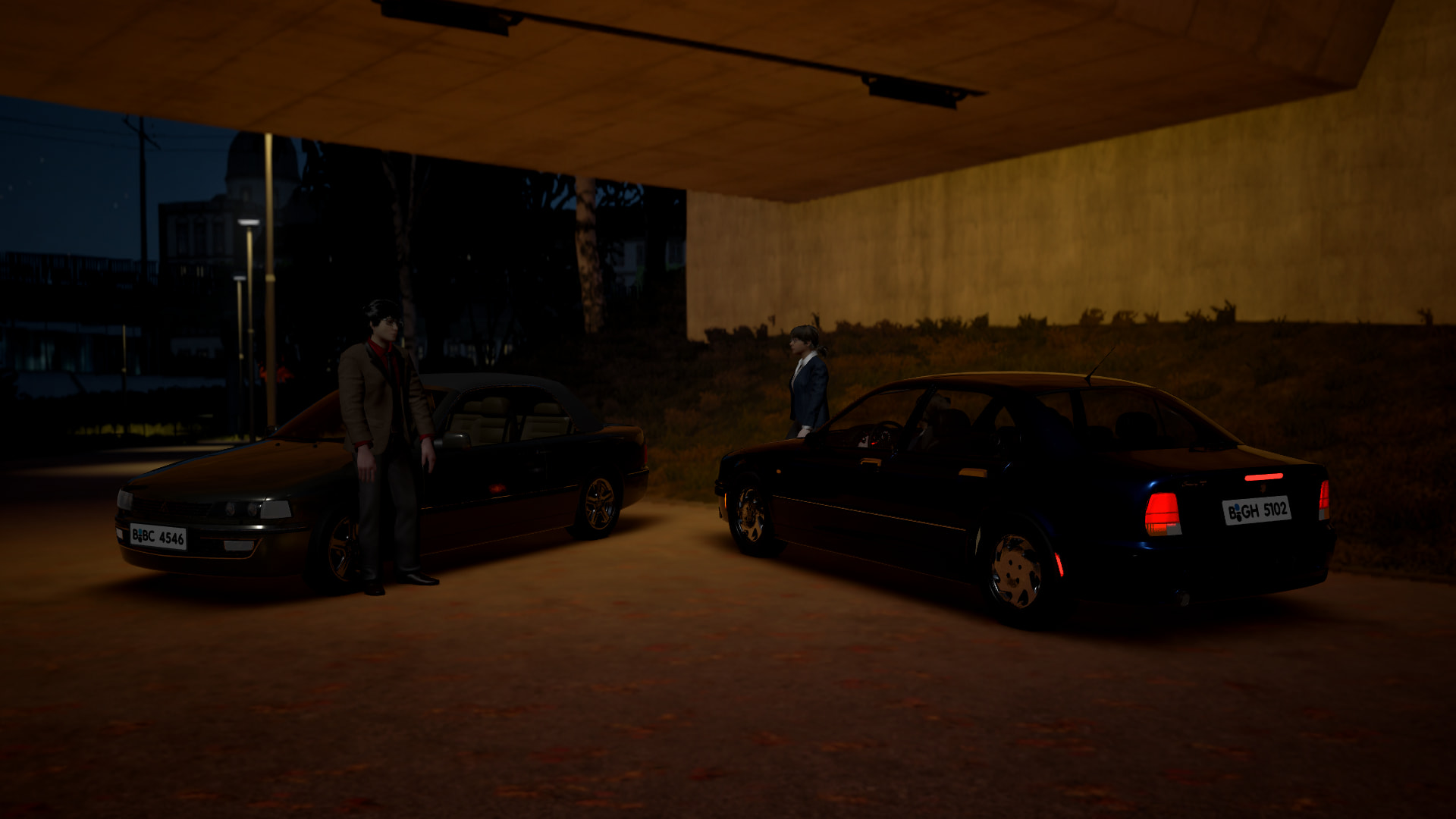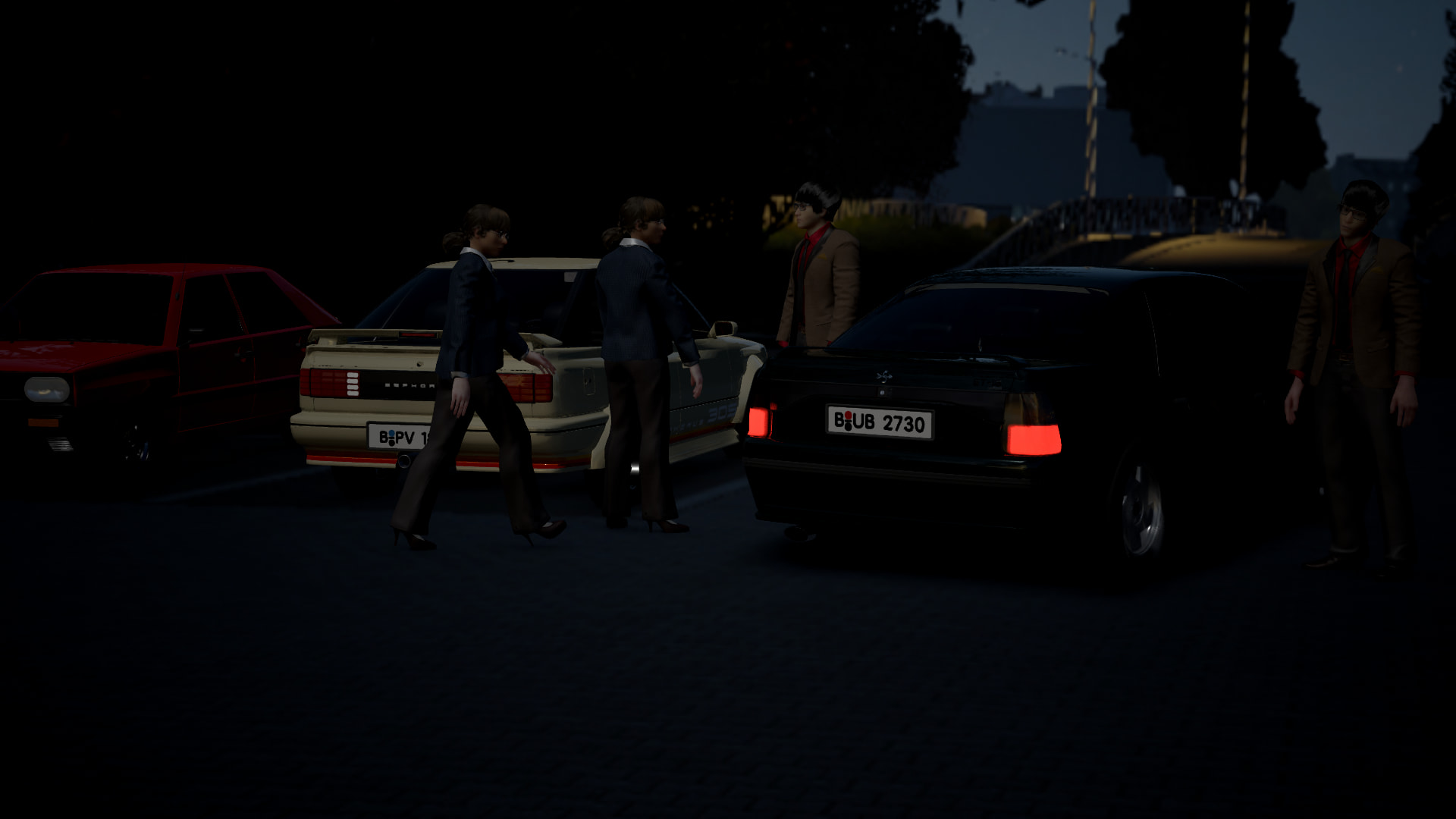 At 9:30 PM Sarah speeds to the meeting point, with Matthias already waiting there.