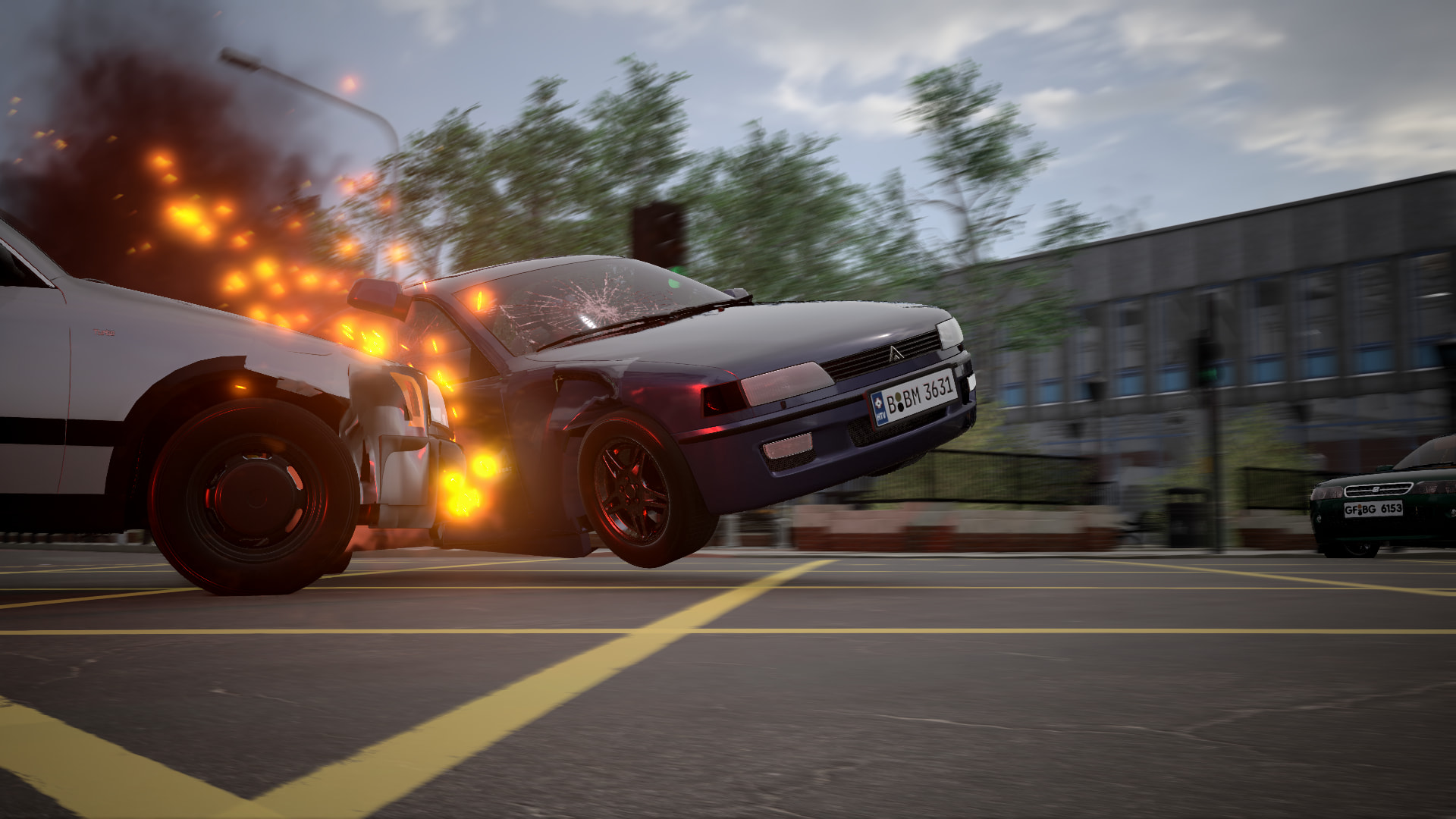 Soon after, the speeding car runs a red light - and crashes into a van. While the modern car protected the occupants well, a side impact on the older van model jammed the driver in it, who is unconscious.