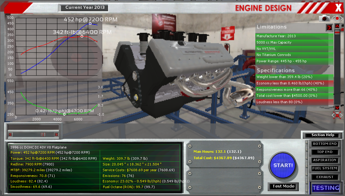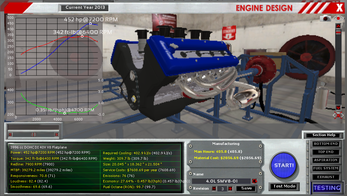 So I was building an engine for the 24 Hour Endurance scenario, but had some massive issues with trying to get it to work right. Went away, came back a while later and started working on it again, but this time just within sandbox. I finally got something pretty close to what I was looking for (a few things to revise, but good enough to see how it looked in the scenario), but when I copied over all the variables to the scenario version of the engine, I got 3 major differences: economy, man hours, and cost. Not really sure of how these are different, but I decided to take a few pictures after double and triple checking my variables.