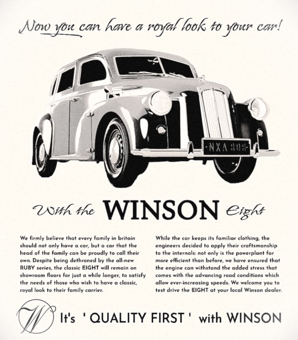 The Winson Eight was originally released back in 1939, but the passenger car production quickly had to be paused until late 1946 for the obvious reason. In 1954, the classic “Eight”, a nameplate named after the taxable horsepower rating in Britain at the time, was replaced by the all new Ruby, wearing a more modern envelope/ponton-style body. However, the Eight remained in production until 1958 as a budget-conscious model, also being marketed as a more conservative, classic style family car.