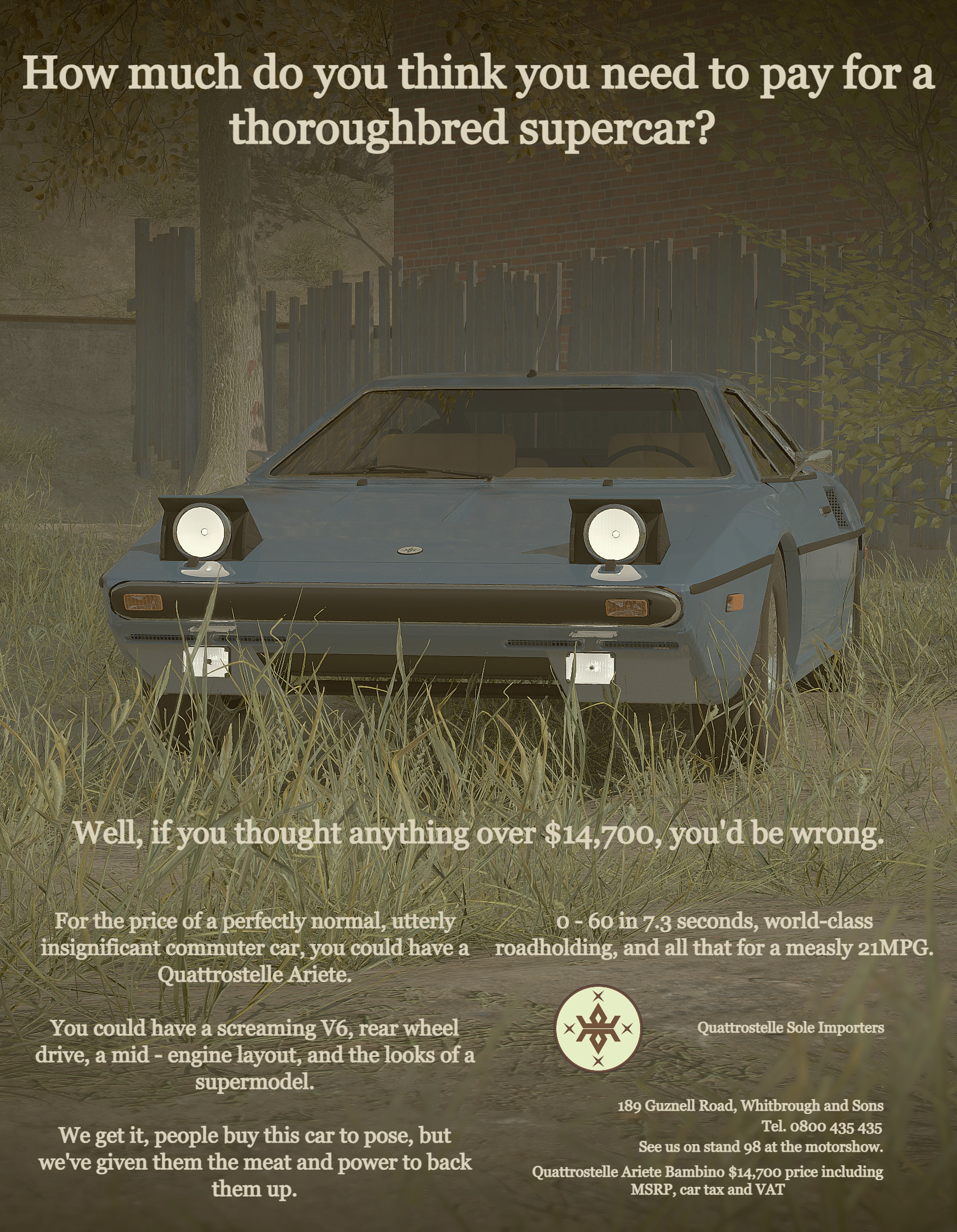 A note on scoring, quality, and realism: I will be using a spreadsheet as a baseline for scoring but reserve the right to deviate from the spreadsheet, including ruling out entries badly deficient in any particular area from being a Finalist/podium finisher. There are no specific realism restrictions, but I reserve the right to give a bonus to entries that nail period-appropriateness or manage to do more with less advanced tech. I am experimenting with unrestricted quality for various reasons, but I reserve the right to penalize an entry if it appears to be exploiting an obvious imbalance in the game design (e.g. you can cut the price of your car by a third while losing just a point or two of score in a category).