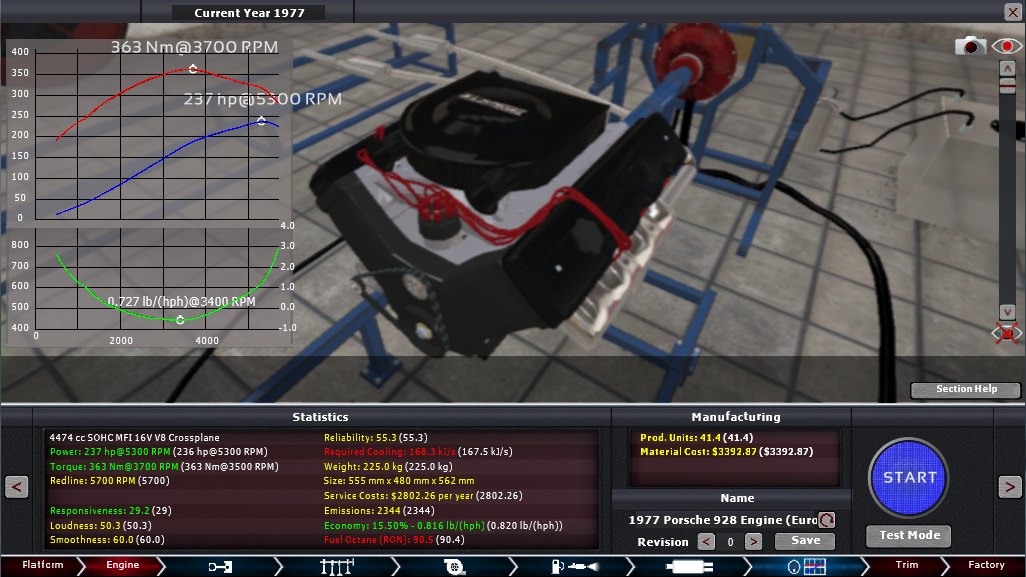 Unlike automobile-catalog which claims the LT5 redlines at 6,300 rpm thevettenet claims it redlines all the way at 7,100 rpm, meaning I couldn’t lower the valve-train quality (without valve-float occurring) like I needed to do in order to make the power come earlier and the torque later. Both sites agree power comes at 5,800 (compared to my recreation’s 6,200) however they disagree on where the torque comes, automobile-catalog says 5,200 while thevettenet says 4,800 (compared to my recreation’s 3,900).
