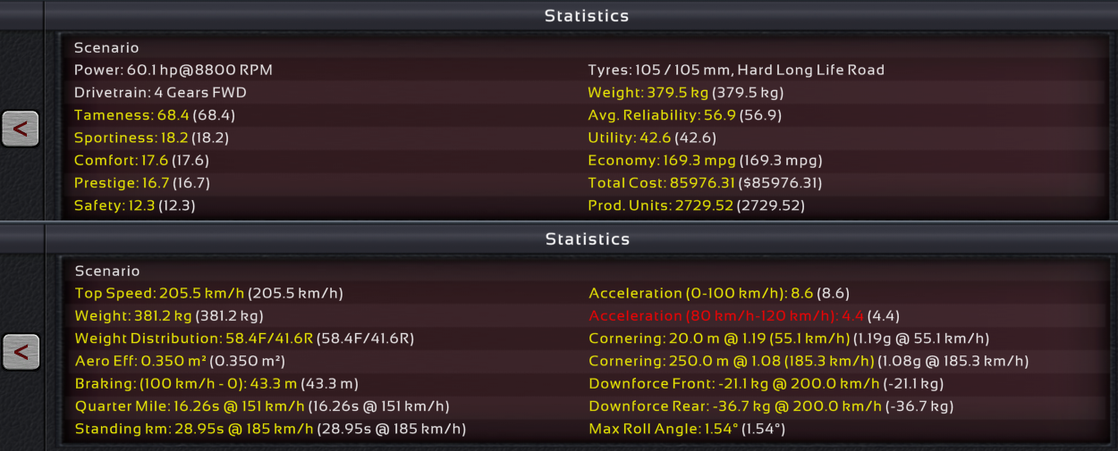 Edit: It says 1.48 L/100km because I added some cooling so the engine has more than 0 reliability. Putting the slider at zero brings it to the values I quoted earlier.
