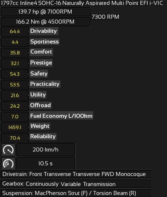 North America Spec : 1.8-liter inline-4 SOHC EFI engine. (140BHP and 167nm of torque)
