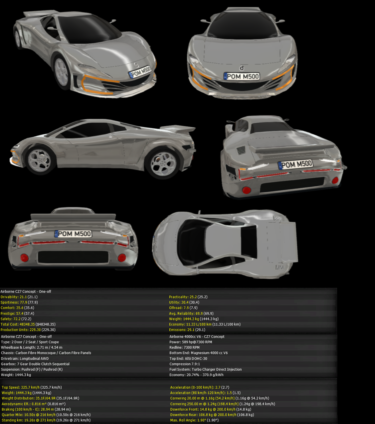 Just for fun, I also built a car using the Aero J6 body from @Razyx with a similar philosophy, but with a 3-liter turbo straight-six driving just the rear wheels (RWD was the only way to get that engine to fit in the J6’s small engine bay, and even then it was a tight squeeze) and developing 400 or 500 bhp. The result was surprisingly quick off the mark, handled brilliantly and capable of very high speeds even with the base engine setup. It would not have been possible without all-composite construction, but I suspect it would not see which way the more powerful AWD CZ7 went… It would have been a nice contrast, though.