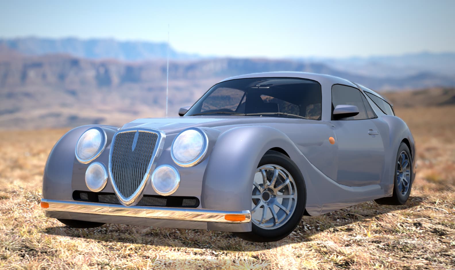 A tubular front bumper has replaced the stock unit. The spider web grille was done by brazing together chromed water piping. The hood ornament is actually original, and is said to symbolize the wax wings of Icarus. Small round indicators replaced the grille mounted stock ones.