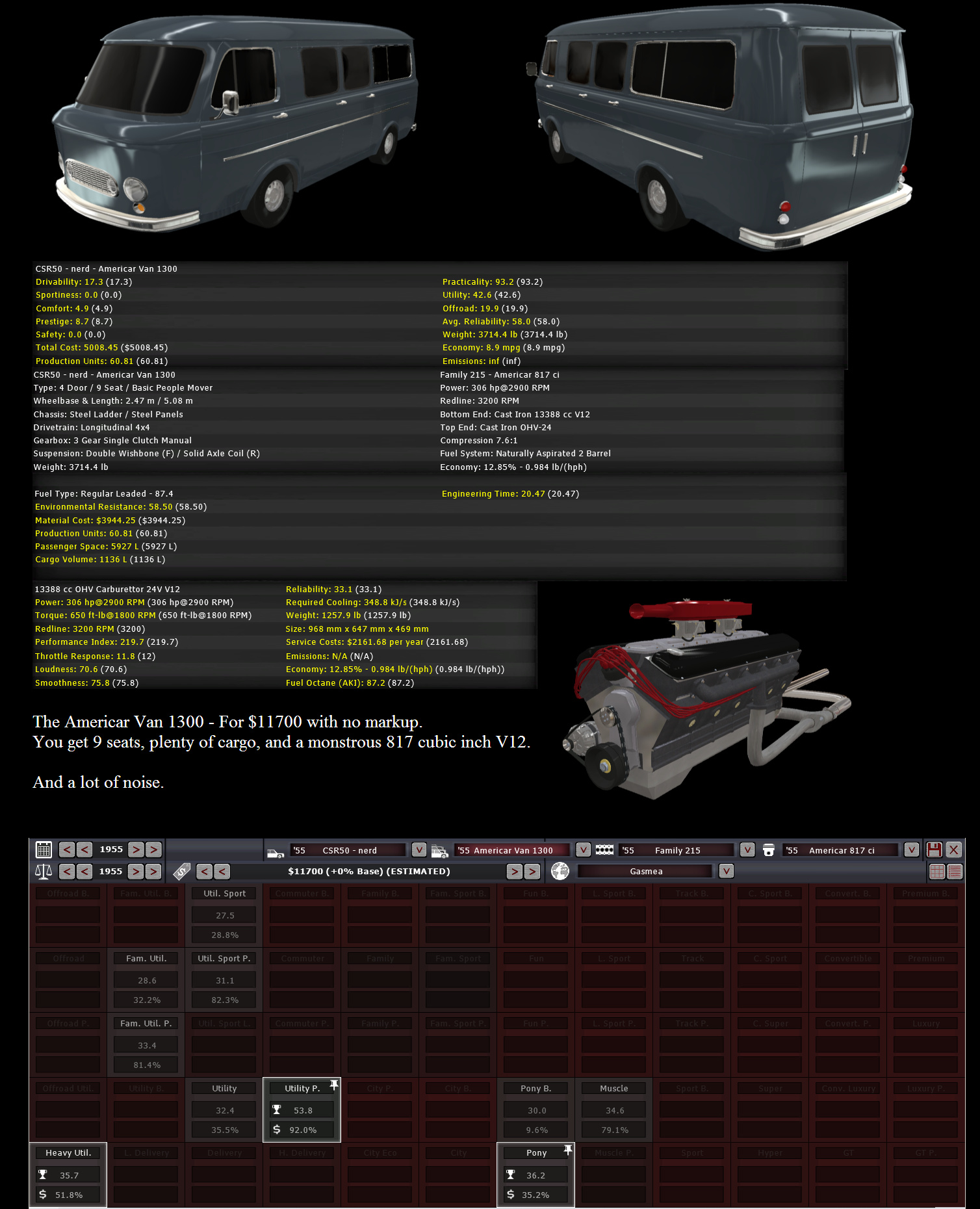 12 seconds to 60 might seems a bit ordinary today. But most family cars of the 1950’s England, cars such as Conan C31 2000 and small Vanquist, those couldn’t even top 90mph and need at least 16 seconds to reach 60. The Vanquist V3 2600 V8 was quite a hot number. The only comparable car of it’s era would’ve been the Ocelot 2.4, but the V3 V8 was faster still, and cheaper to boot.