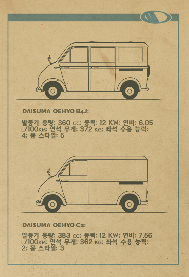 While Daisuma is one of oldest vehicle manufacturers in the country it was ravaged by the Japanese occupation. Prior to the war, it produced a line of motorcycles and small Myeob cars using many licenced parts from foreign nations.