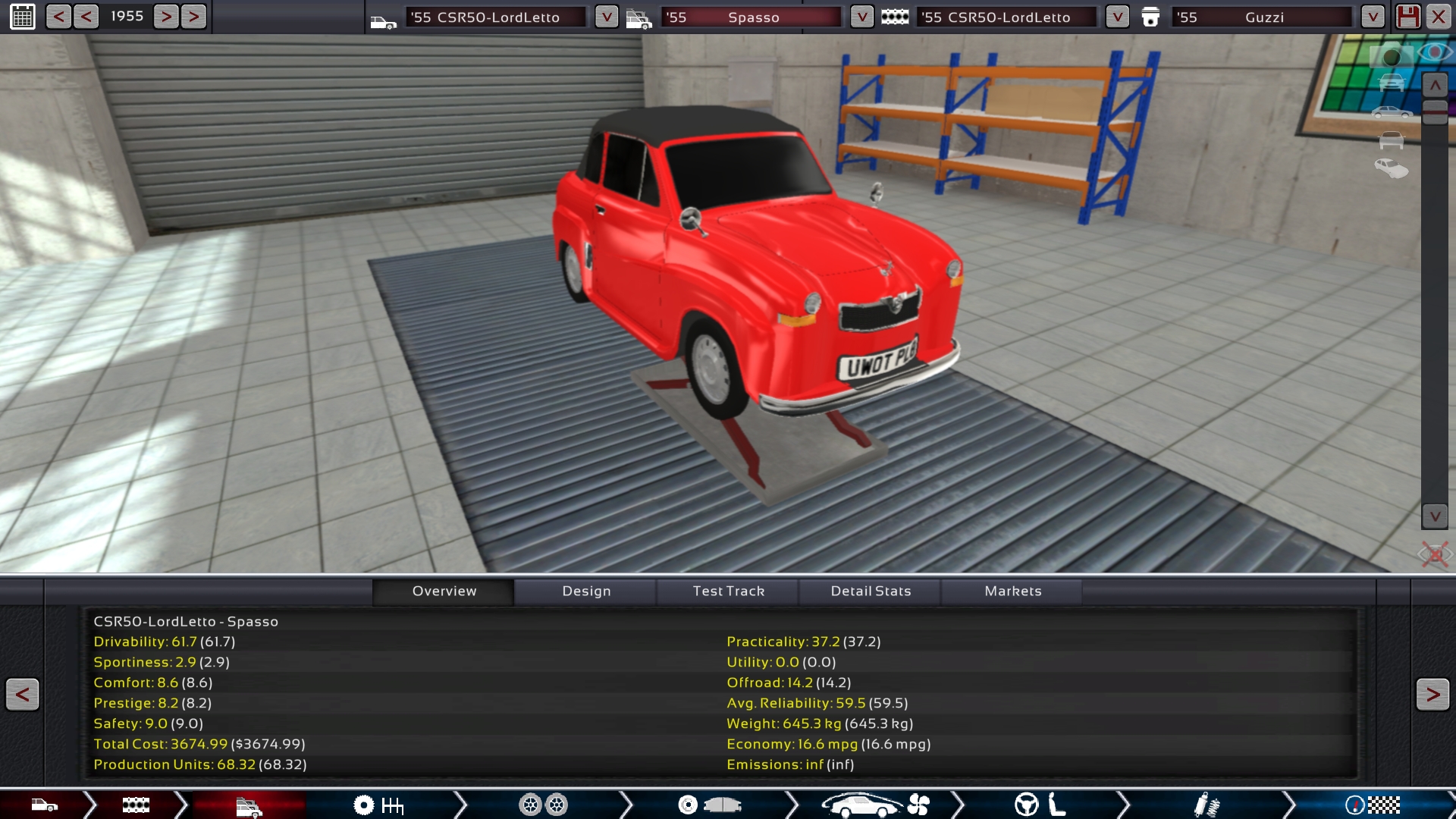 Aside from the engine, the rest of the Madeira is again quite conventional. The car does 0-60 in 8.3 seconds, and the car can corner at 0.85g with a balance between oversteer and understeer. The brakes are significantly underpowered (unlike the Trident), and the car lacks power steering despite being one of the heavier cars I’ve driven. However the interior is spacious and comfortable, and comes with a nice radio.