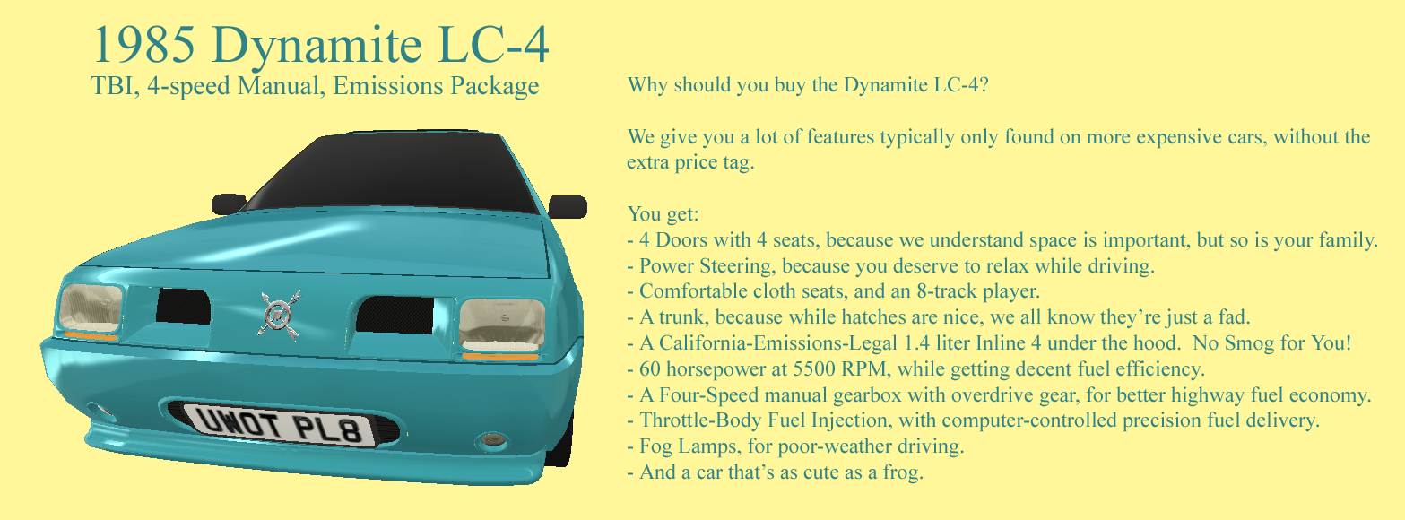 Designed as an inexpensive FWD sedan, the Dynamite LC-4 has quite a decent features list for the price-point. Built to the demands of the California Emissions Requirements, the LC-4 wears a catalytic converter proudly, while still making a proud 60 horsepower from a 1.4 liter inline 4 under the hood. Sure, other cars use that leaded crap, but when the smog bans roll in and leaded gas disappears, the LC-4 will still be driving around.