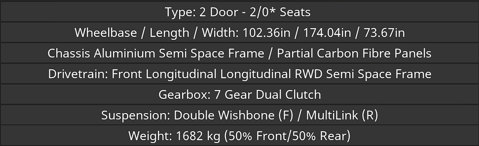 Even with these back to basics approaches, we made the car as comfortable as possible without harming performance. This is no Bentley Continetal, but the adaptive dampers should make for a smoother ride over the bumps. An infotainment system is included, with a 2+2 seating layout. The car keeps an impressive 1151 kg.