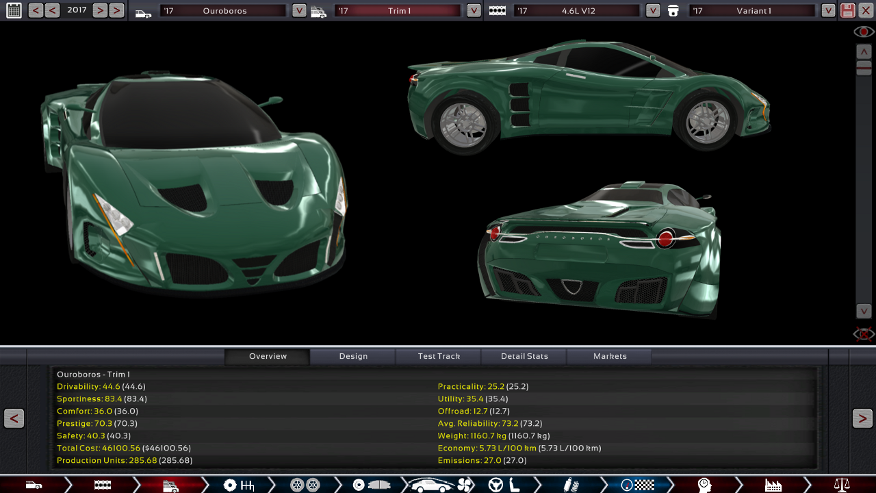 Yes, Ouroboros is all carbon. Thatâs because GGâs sole manufacturing and fabrication pipeline for the body is CF. Thatâs what they started with⌠so itâd actually be very expensive for them to attempt to start fabricating in other materials because theyâd have to retool. I do think that the way I treat the numbers hasnât really conveyed just how worlds apart the cars are despite the fact they could get similar times on certain tracks, and thatâs partly my fault because I take some liberties. The rest, however, are rectified by features that will be discovered in campaign mode. Not that I could create a company like GG in campaign mode, anyway!