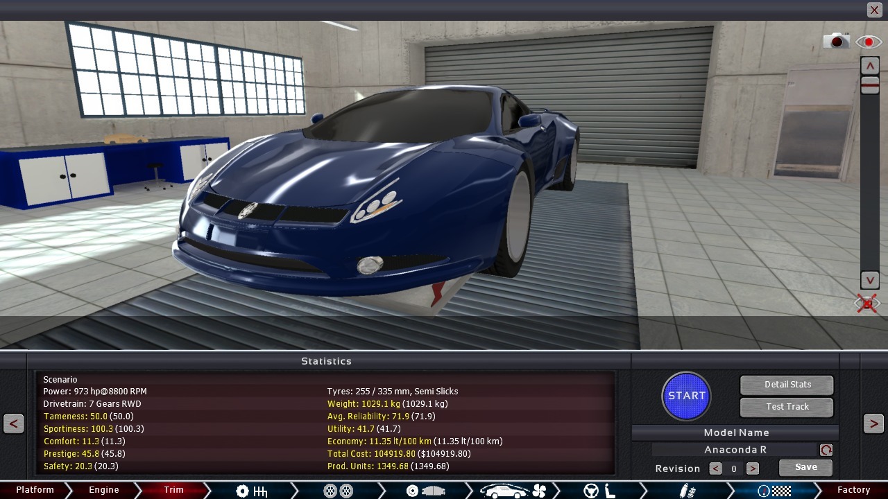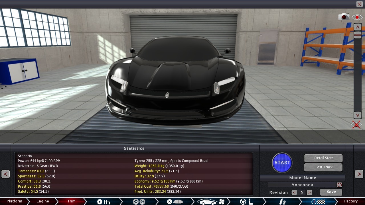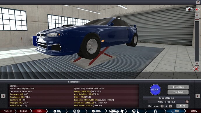 I chose “Set yourself new standards!” as the slogan because this car is comparable to a Golf GTI (with performance pack) in terms of size and price. But then the Weta will pull ahead in terms of acceleration, comfort, luxury and fuel economy. It’s just a car that you’d love to drive every day. It’s also very practical as you’ll see later in the screenshot of its main stats. It’s not tuned to be sporty, though. It doesn’t even have lips.