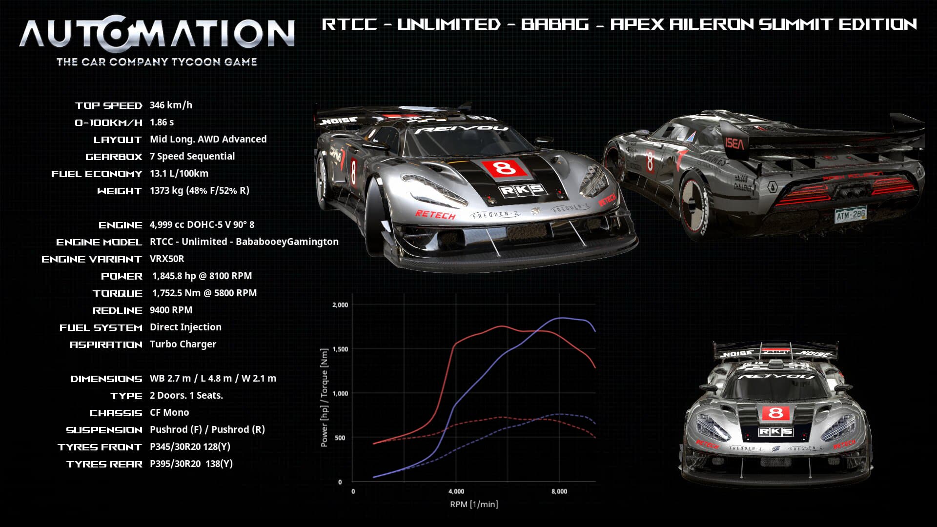 Introducing the Apex Aileron Summit Edition, racing under the number 8 in the Unlimited category. Powered by a high revving monstrous 5L Twin Turbo V8 engine making over 1800hp and 1700Nm - the VRX50R. This rocket was build around its road Hyper GT version, inspired by the McLaren Speedtail, Koenigsegg Jesko, the 919 EVO and F1 technology. Advancements were made in the aero, engine and suspension setups. After numerous tests and iterations, it succesfuly broke the record set by the IDR, but perhaps there is more time to be gained.
