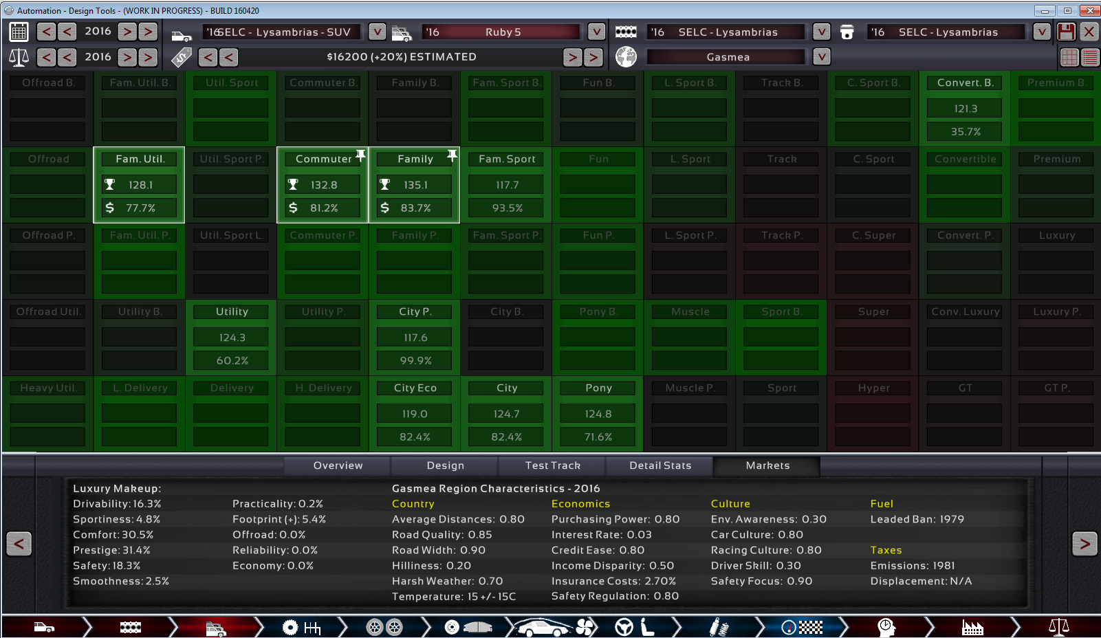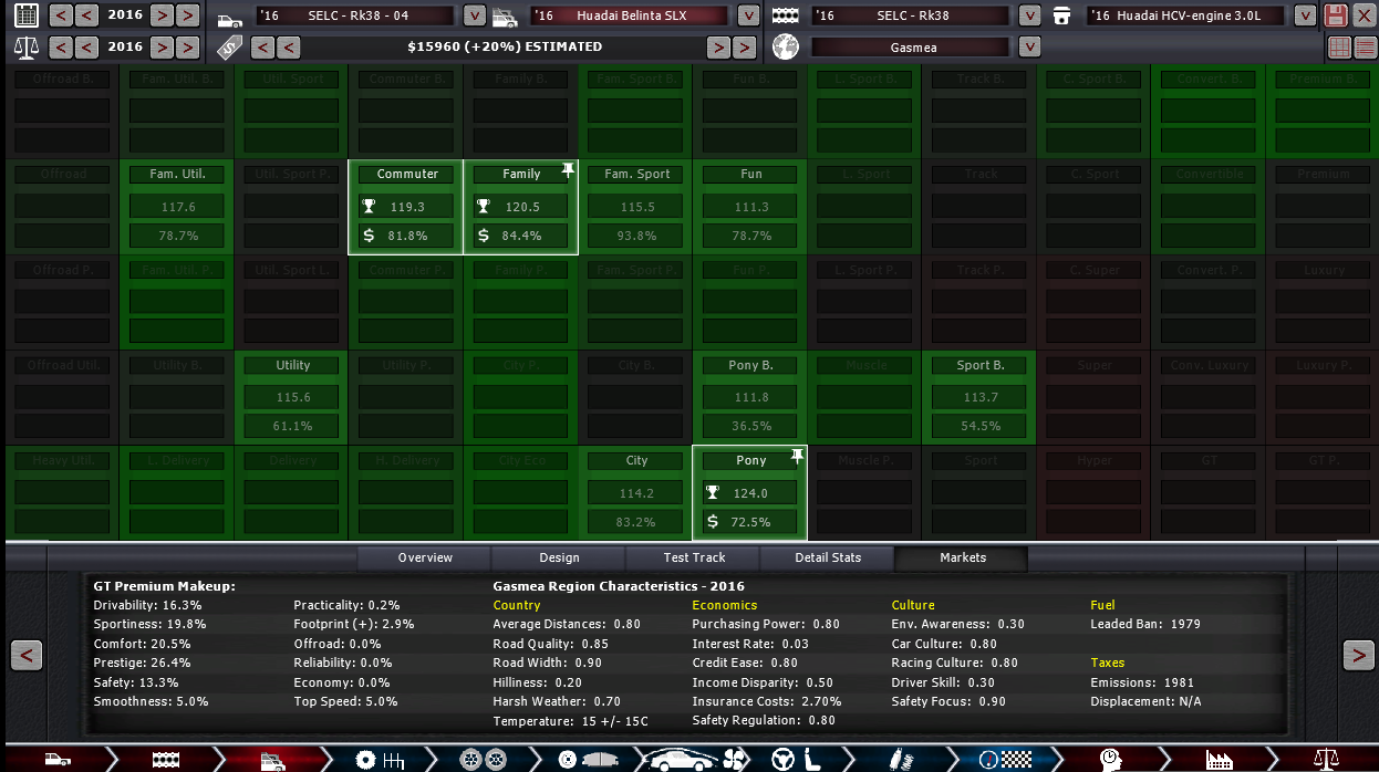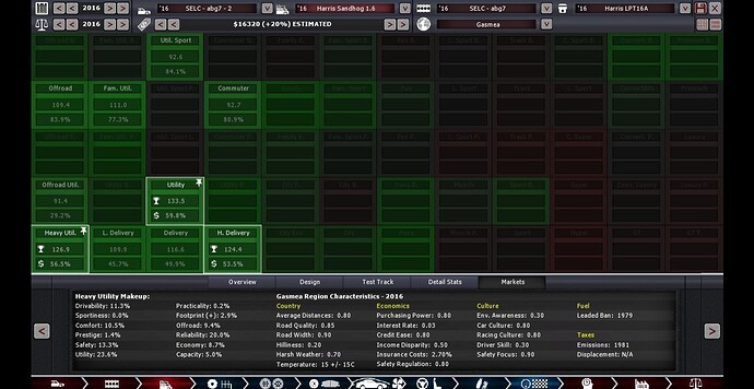 I’m currently working on a three car lineup, although I’m a bit surprised that the same SUV that scores well for Family Utility is also my best City and Commuter car. I really didn’t expect to have both an SUV and a pickup in the lineup. Sounds like Gasmea is the “US” region in this game?