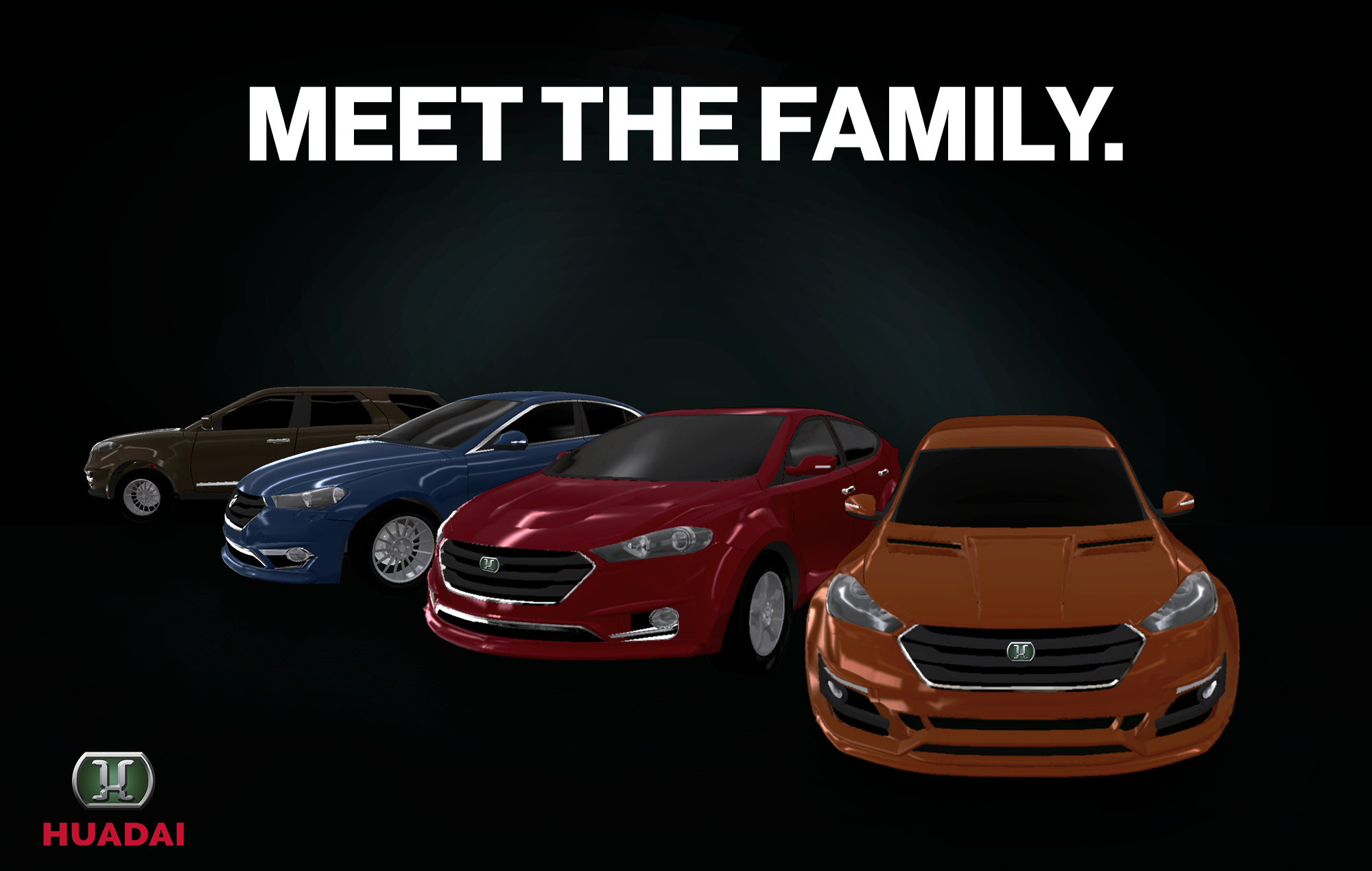 Huadai Motor Company would like to showcase the following vehicles which are powered by the all-new 3.0L Huadai HCV V6 engine. The four vehicles on display here are the full-size Huadai Belholt sedan in entry-level SX trim optioned with AWD in Brillance Blue Metalic. The Huadai Duskan sports utility vehicle in entry-level GX trim in Bronze Mica. The Huadai Pernix hot hatch in top spec GS trim in Tangerineburst. Finally the Huadai Belinta compact sedan in top-level SLX trim and in Gumdrop Red Mica.