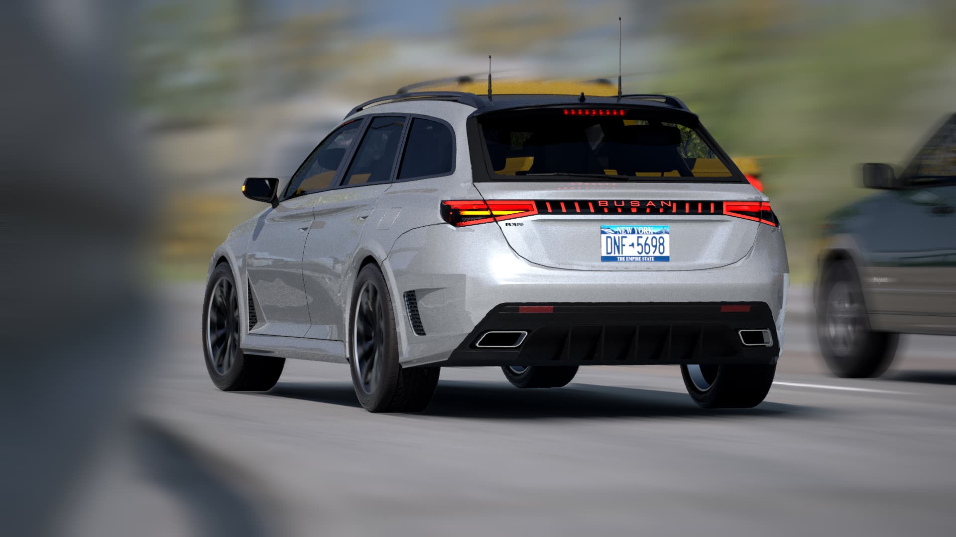 This trio of young drivers – who all dress in identical clothes and wear identical masks to thwart the police – are as much speed freaks as they are fans of the superior, practical and useable body style, the station wagon. They believe that the advantages it offers outweigh any attention such a car might draw for its rarity in the United States. For the 2024 Cannonball run, they have chosen the Busan B3R Touring, a hot compact wagon intended for the European market and imported to North America in limited quantities. While it has a relatively small footprint, its interior space, both for passengers and cargo, is nothing short of stellar. Its powertrain offers a reliable 360 hp, all-wheel drive and an optional 8 speed dual-clutch transmission that is perfect for long-range, high-speed runs. Equipped with the Premium Comfort package, it offers high-grade interior materials, adaptive suspension and advanced driving assists, adding to its suitability for the continent-crossing task. Meanwhile, the Performance pacakge raises the speed limiter to 299 km/h and adds electronically-controlled limited-slip differentials. As far as modifications go, the team has installed a race-spec fuel cell in the cargo area, which complements the standard fuel tank in order to minimize refuelling stops. Dual UHF aerials are mounted on the roof, for communication with scouts and for scanning police frequencies. Auxiliary equipment includes a GPS navigation screen, RADAR and LIDAR detectors and phones for redundant police scanning, timing and navigational duties, while a large case sits in the spacious back seat for drinks and snacks.