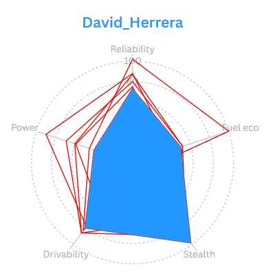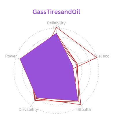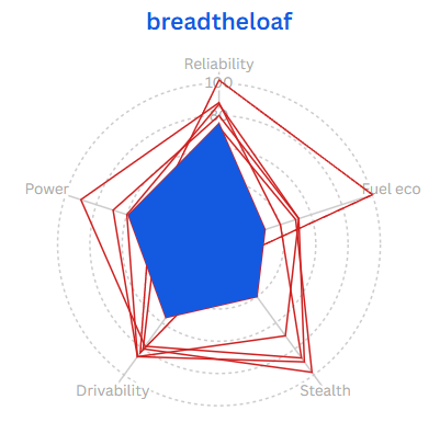 so wow this is like THEE hypermill car, like not only is this car the most reliable inthe pack but its also the best at fuel eco by a super super long shot. it also is second best at how easy it is to drive, but lord have mercy you picked the most flashy car of all time making you the biggest target in this whole challenge, tbh you should be lower but with how amazing this car is at everything else the cops just had to let you go after the night