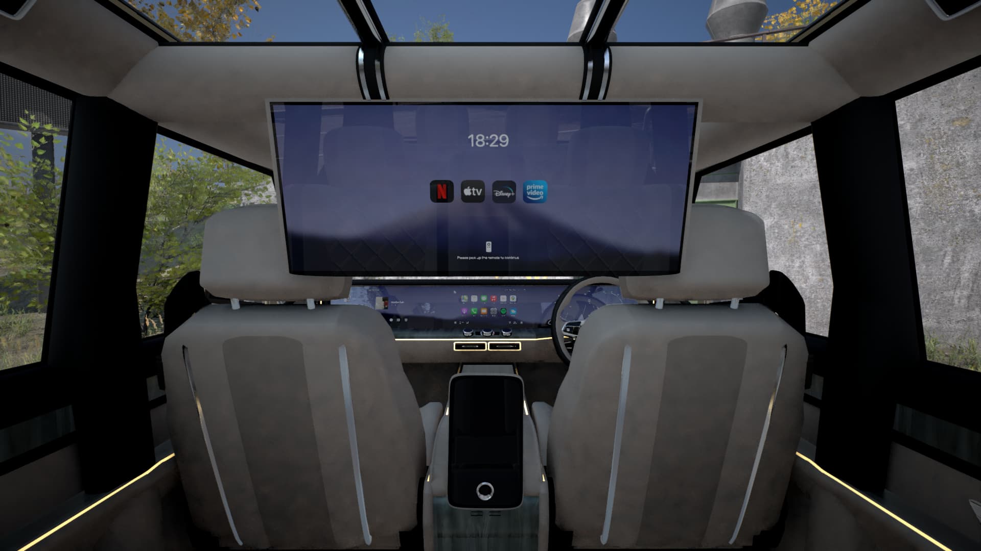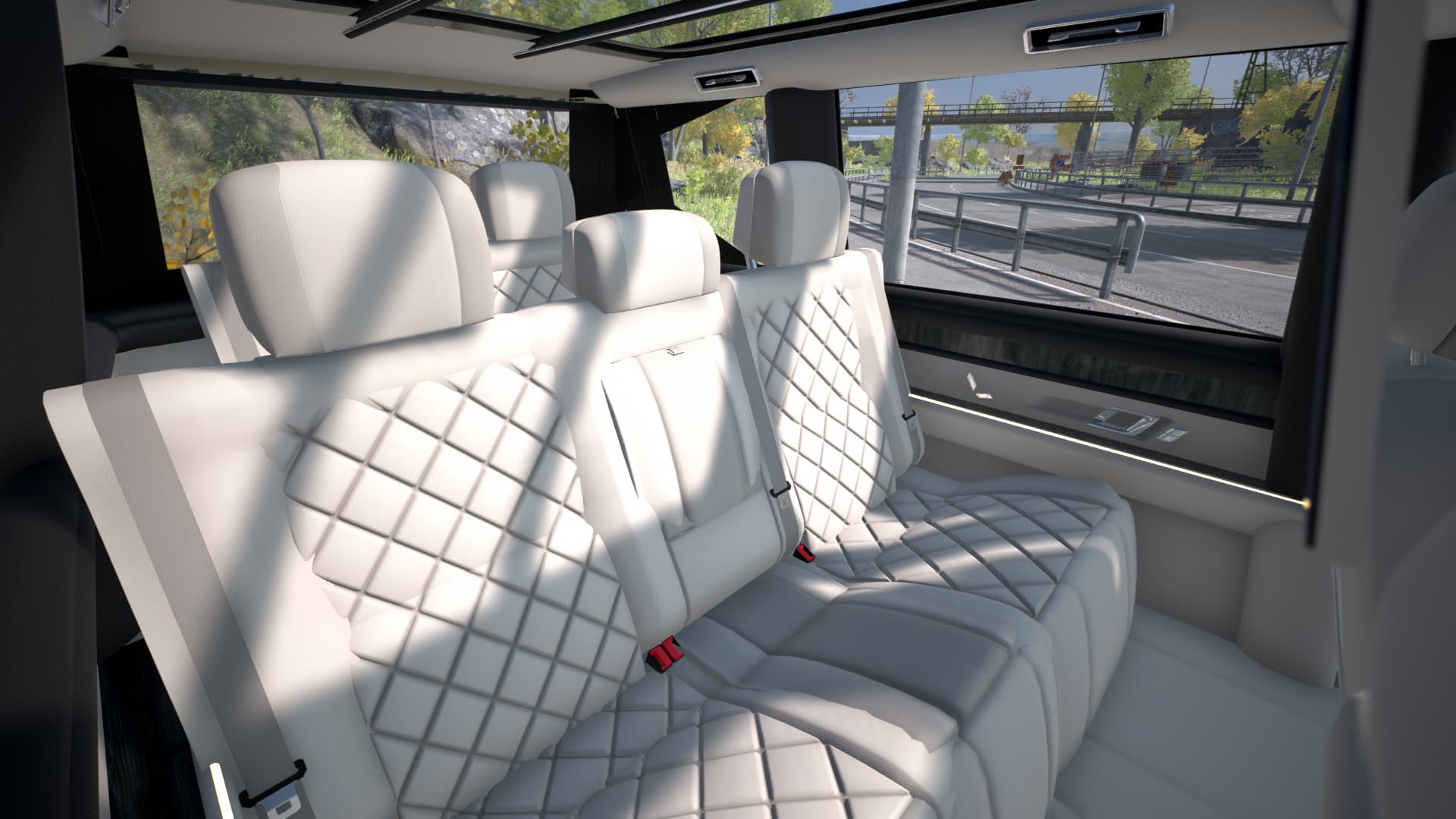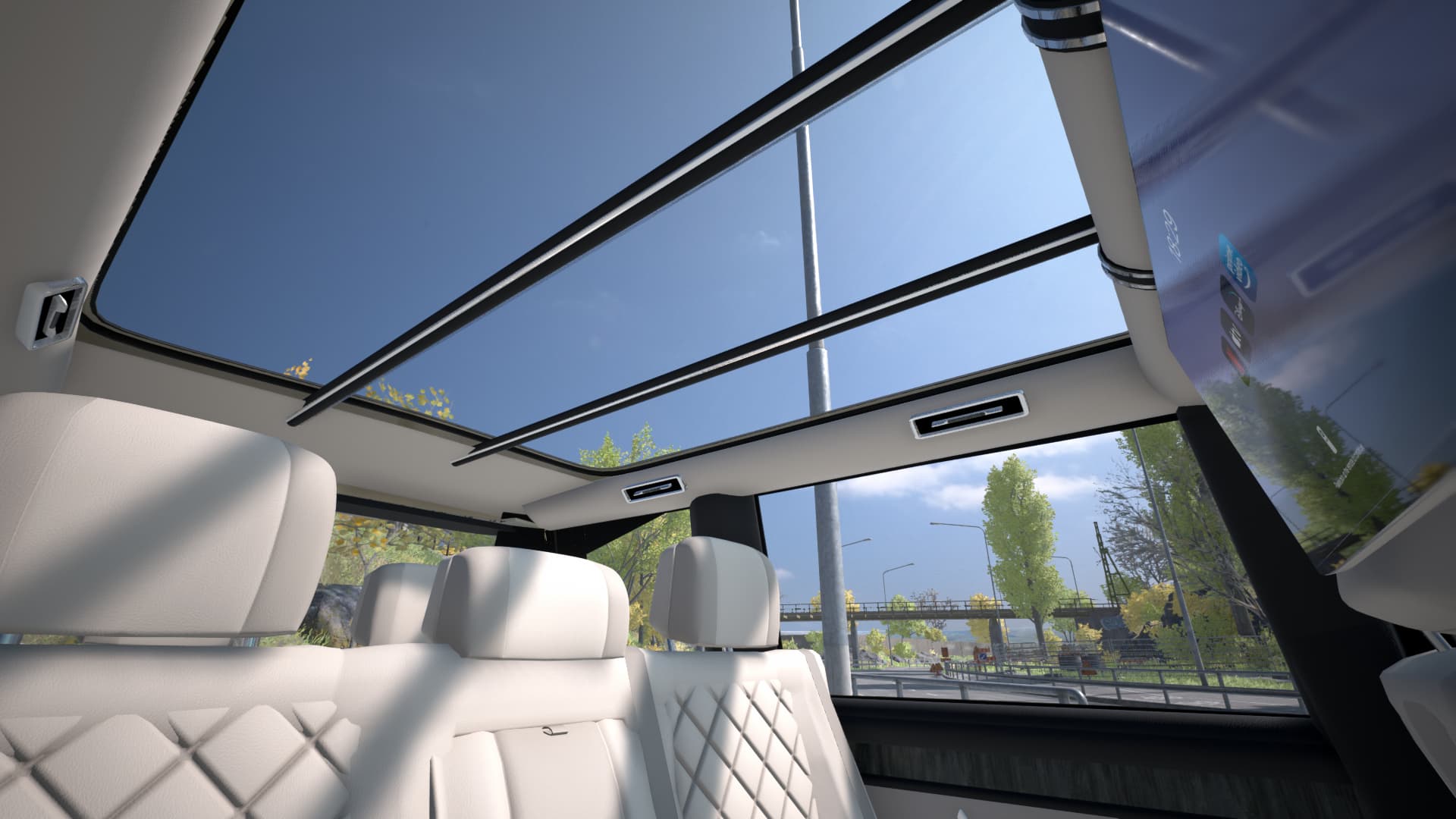 If you prefer to see the outside world, you would be delighted to see that the cinema screen can be folded up and retracted all the way back into the back of the car using these rails above. Once the screen is gone, the interior becomes a lot more airy, with the large side window and panoramic window providing great outside visibility.