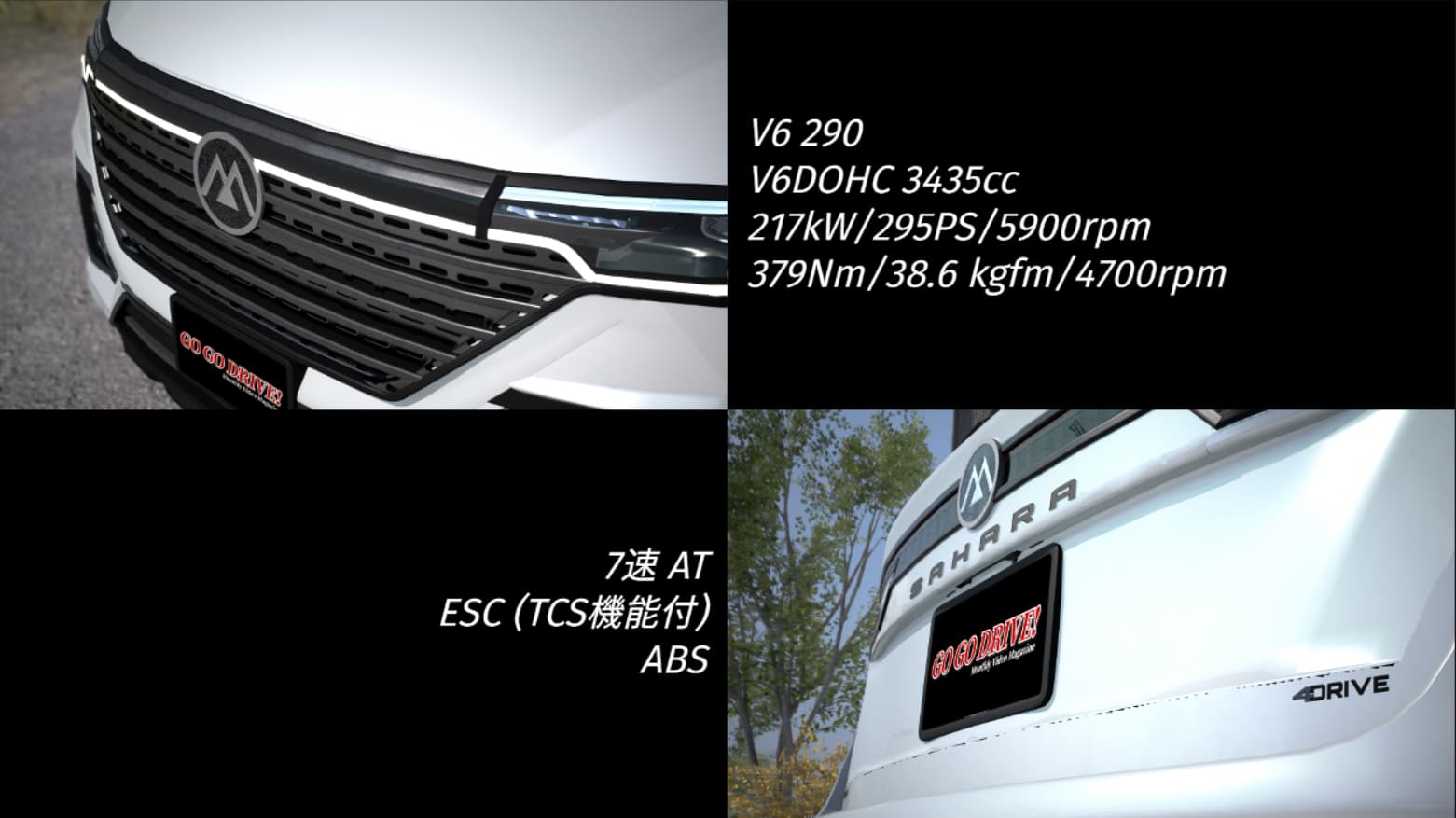 The Sahara we have today is powered by a large, naturally aspirated 3.4l V6 producing a healthy 295PS. It is equipped with air suspension, adaptive dampers, and an active swaybar system. Its wheels are large in diameter, at 21 inches.