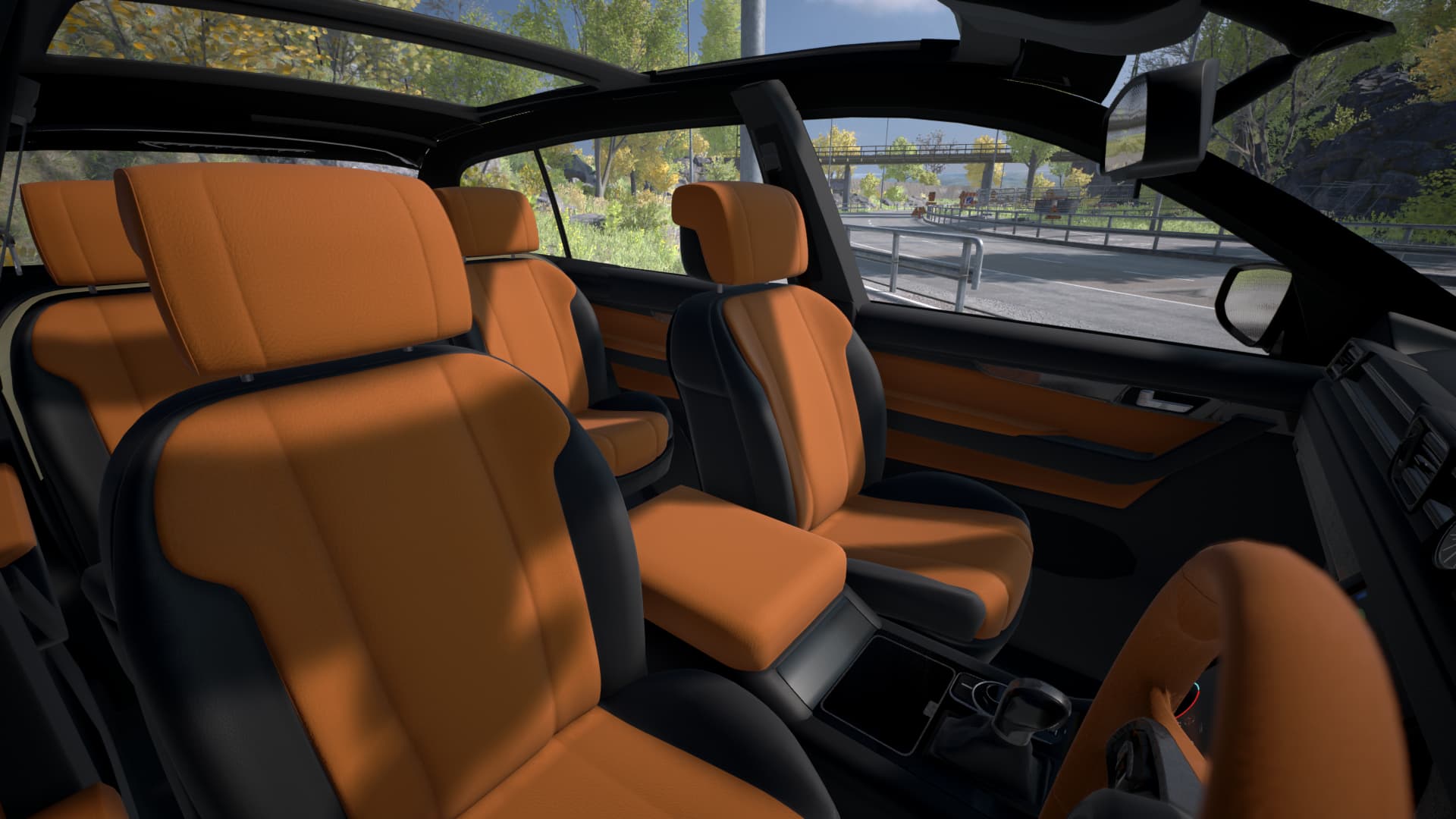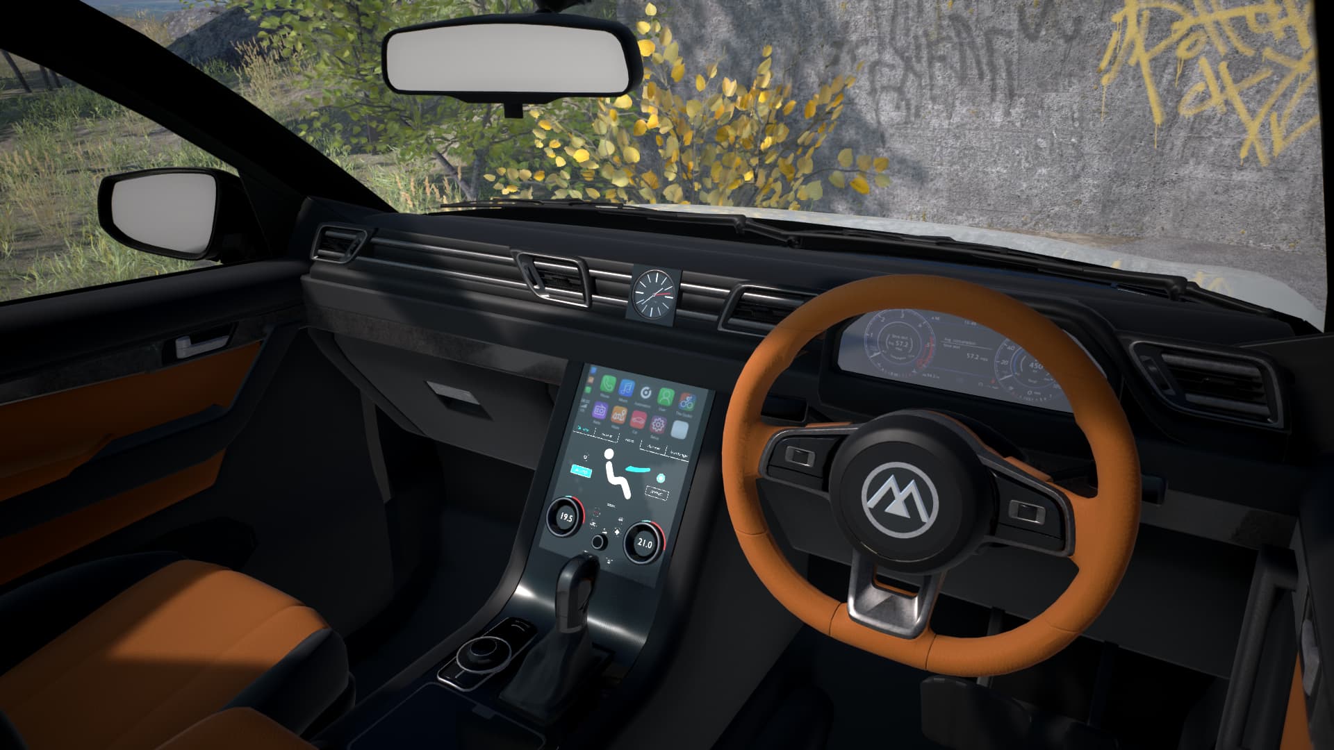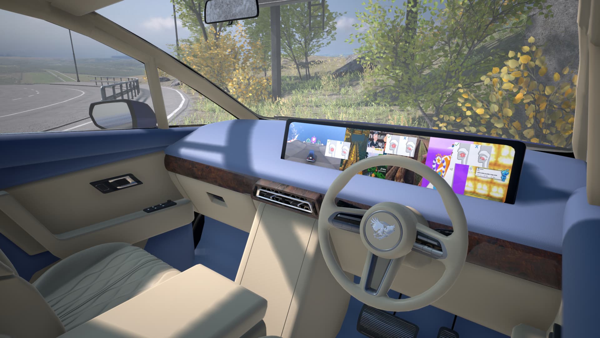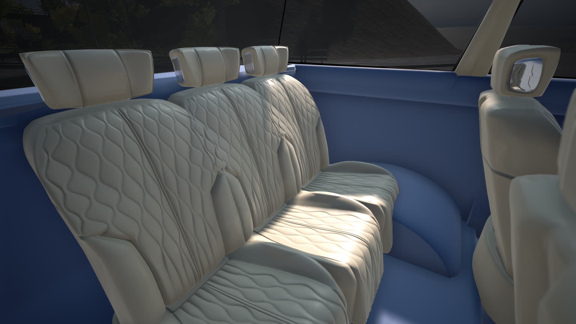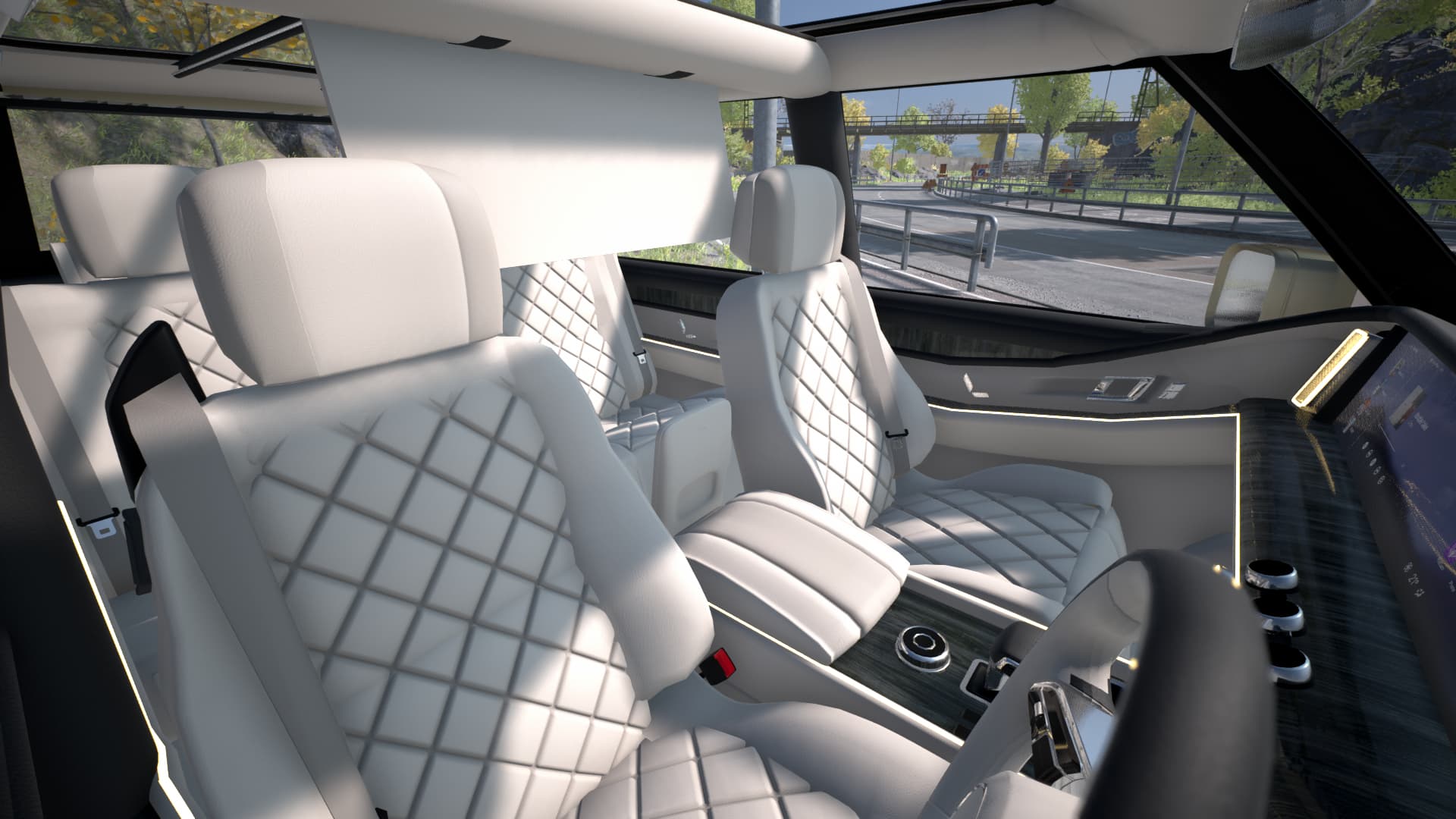 The aforementioned blue and white leather scheme continues up front, and is joined by eco-friendly wood venner on the dashboard providing some contrast. The rest of the dashboard’s design is simple, with the lack of any buttons anywhere except the steering wheel. This is all a part of what Bellomont calls the “AttentionMaxxing Environment”, or AME for short. This system is designed to maximize driver attention on the road, and minimize the chance of accidents caused by driver error. By eliminating buttons from areas that are hard for the driver to reach, distractions are eliminated and attention to the road is maximized.