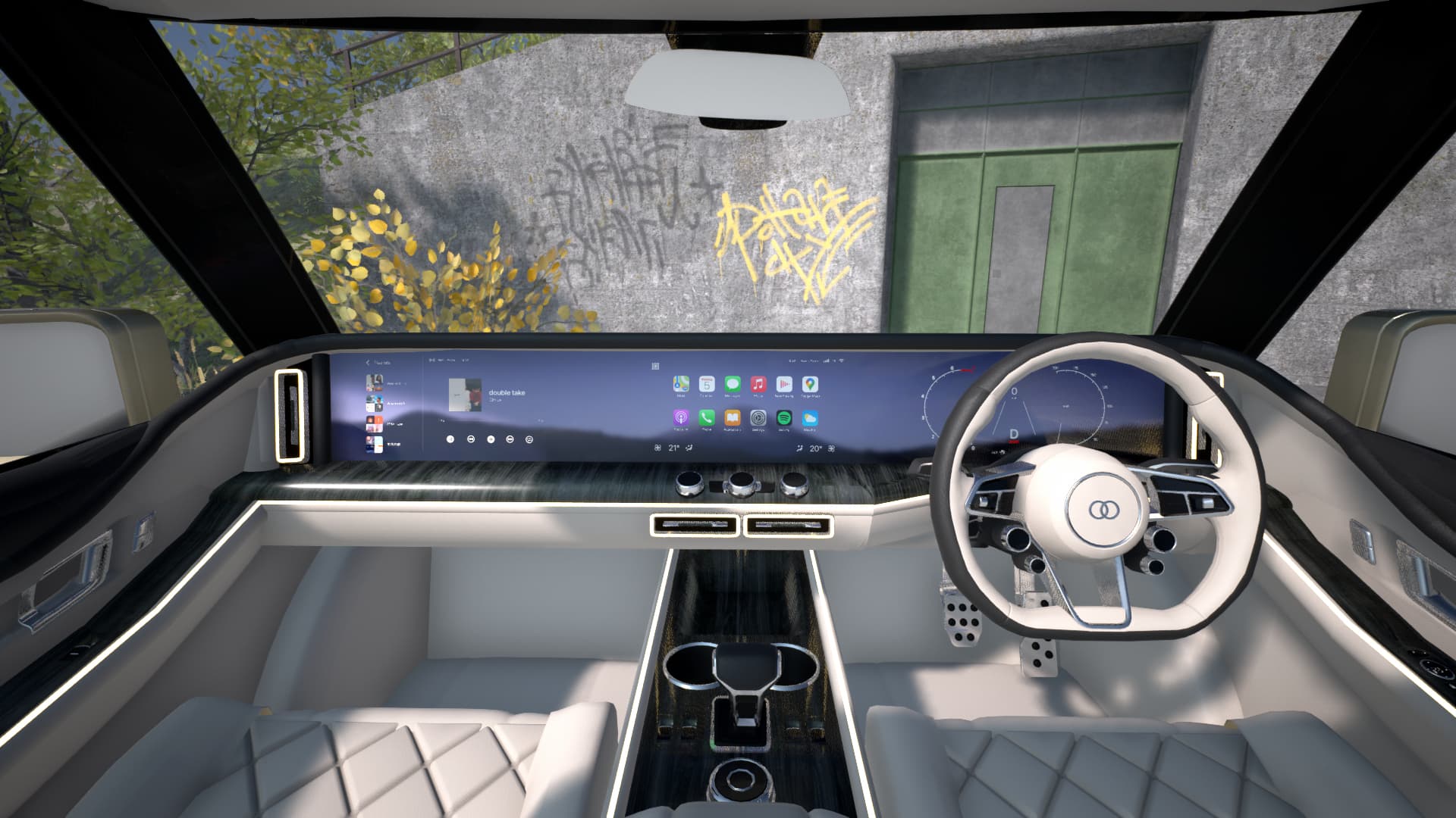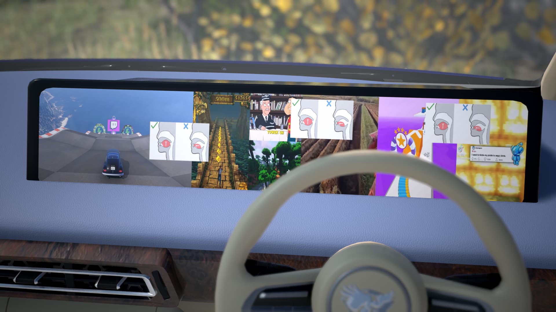 The true centrepiece of the AME, however, is the centre screen. It is a long, expansive display that shows multiple short-form content windows side-by-side. During a long drive, drivers can often find themselves distracted or sleepy due to the boredom and monotony of the surrounding scenery. The screen and the contents therein keep the driver stimulated, and thus more aware of their surroundings. The contents shown on the screen can be changed by pressing a button on the steering wheel, or by performing a swipe gesture in front of the screen. Let me demonstrate.