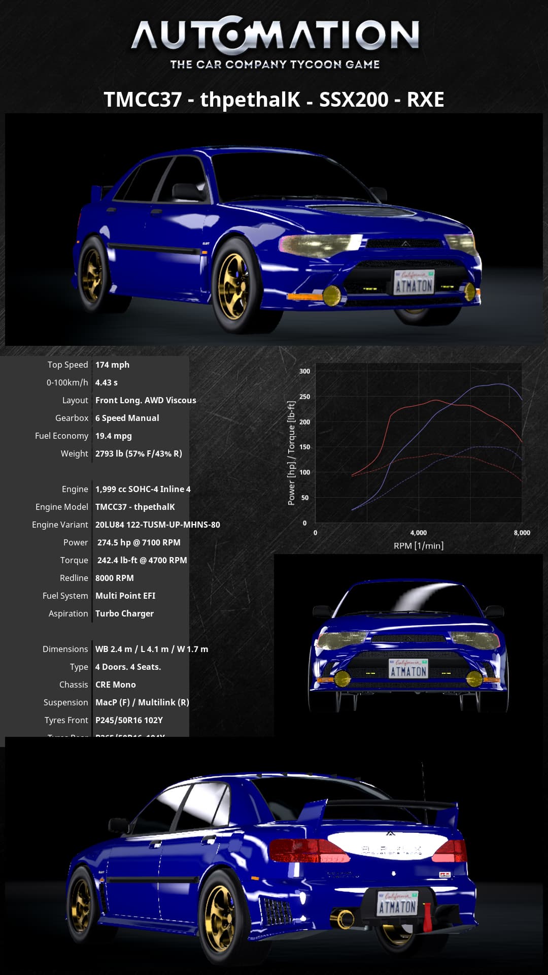 CBC autos, a struggling company, is trying to figure why their sales have been low and recently have launched multiple hopeful race programs in order to boost sales, their team focused on their leading coupe “Nasim” with some GT style racing but a few engineers in the back were experimenting with their basic compact sedan model, a lil wing here, a turbo there and some witchcraft and bam, Tanner 25T was born… The engine was based on the 1.8 liter that came with originally but they increased the bore size, and change the headers to an aluminum header to go with the new DOHC system and a small but mighty single turbo setup boosting the original 134HP numbers to 277HP (limited due to a gentle men’s agreement, but no torque limit so…). Surprisingly powerful, kinda reliable and fuel efficient. The car itself wasn’t much different from it’s base line sister, only a new hood and a wing on the back, after all, this company does not have money to redesign a whole new parts section. But then the executives and financial got a wind of the car and since so much was already invested in this project, they green lit it for a rally race! With that, engineers got back to work designing a AWD system with a strange choice of Double wishbone on front and coils in the back. Results were a jack of all trades, master of none type of car… it wasn’t the best looking, most reliable, most fuel efficient, nor the safest or fastest but it was in all of those charts, somewhere in the middle.