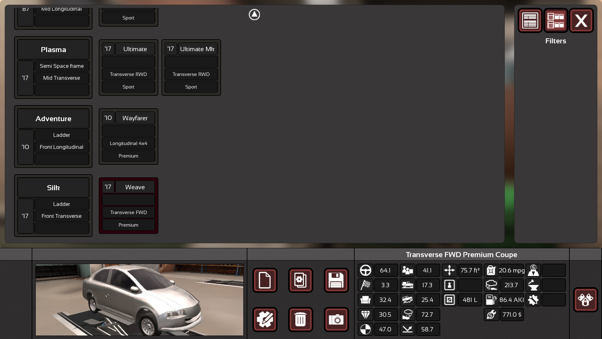I’ve made a car, complete with a 3.0 engine, and this one shows in the list. Then I cloned that only trim to make another with a completely new 2.4 engine, and the 2.4 doesn’t show at all in the list, whether I open it through the car or through the main menu.