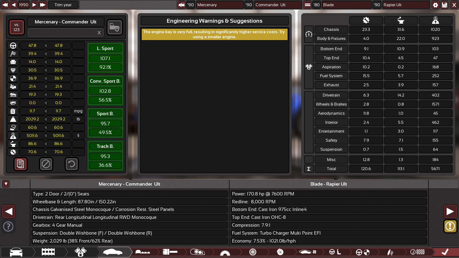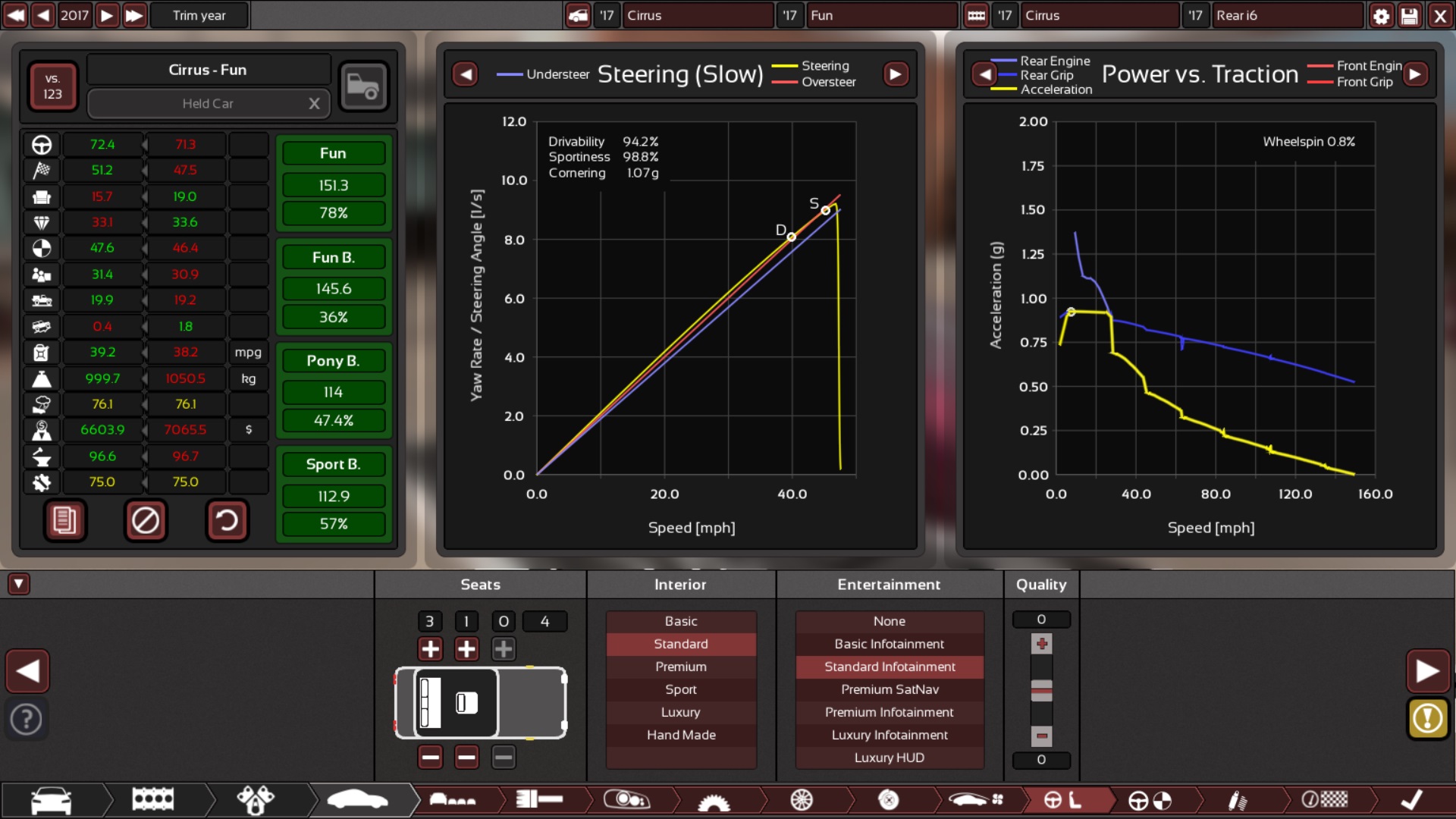 So I decided to practice some of what I was learning from the videos, but couldn’t get the demographics to become that good with a reasonable setup. So I took things a bit sideways and it worked, then took it so sideways that the car scores well in so many categories even though it is total shit. It isn’t spine crushing, but it is deafening and you will get numb butt in a matter of minutes, and it wouldn’t actually be sell able in any country due to the pollution.
