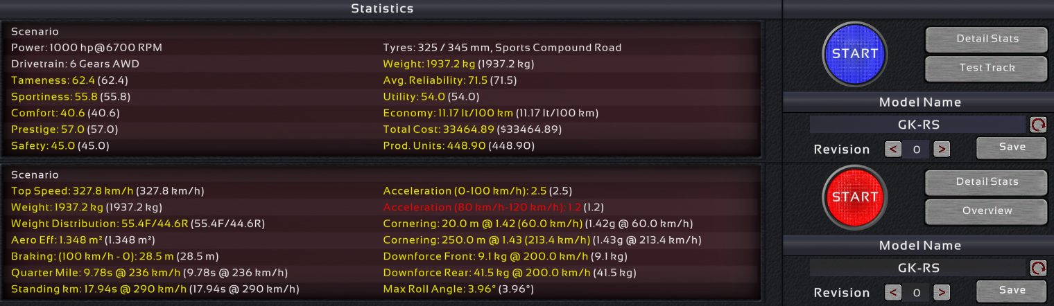 I held back on the POWA meter because I wanted to change my approaches, play with other things, branch out to see what it was like. Turns out I’m a pure horsepower tyre smoking tear-your-face-off on the track kind of guy, because the feeling of persisting with suboptimal choices to eke as much out of it as possible just doesn’t quite get my jollies off. I’ve got a lot of margin to play with when it comes to money and economy, and I have heaps of points over the baseline in many of the stats… but I still feel… underpowered. Like instead of a 3.8L 6 cyl like the GTR, I should have gone for like a 5.4L 6cyl that puts out 850bhp and 1000nm (which was easily doable btw, and still did better than 20mpg). THAT’S more my speed. But eh, there’s always redevelopment. After all, I’m pretty pleased with the styling, and that’s a start.