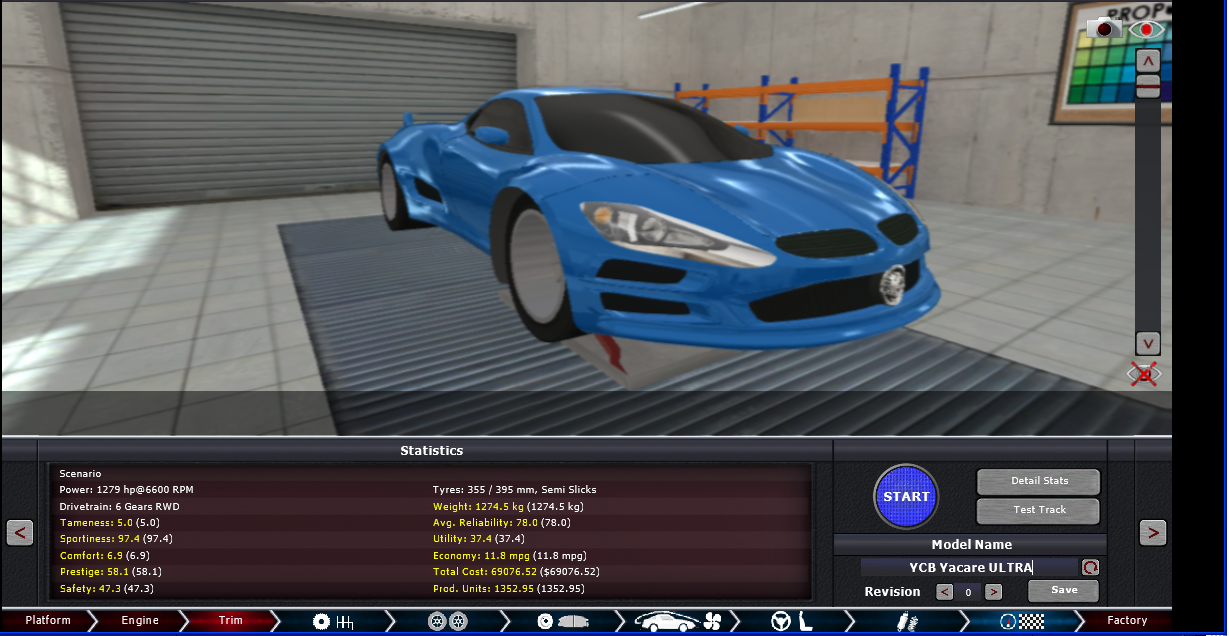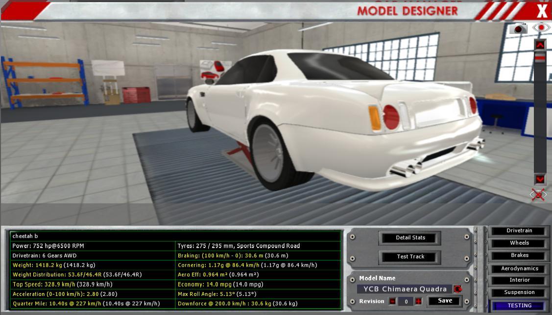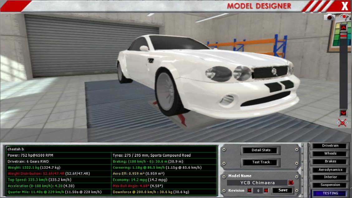 I think you should make your stats higher, 34 sportiness is the level of my 1600kg V8 touring car, the 1995 Yajiri, you should go for at least 40-50 with such a car