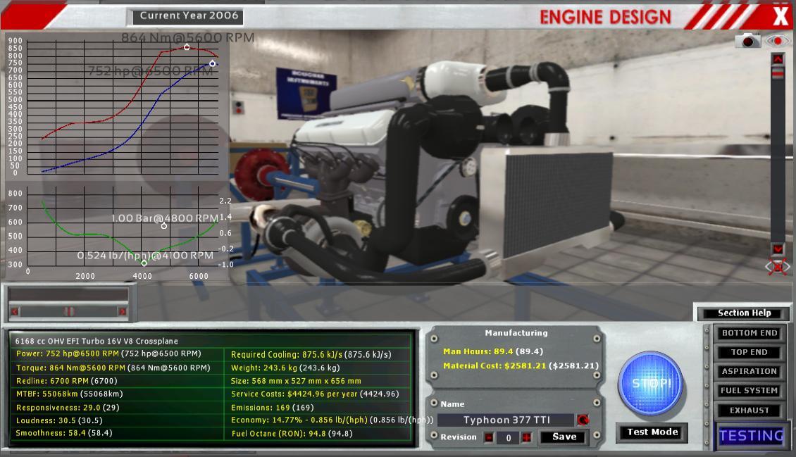 and this is the engine a very special derivate of the original typhoon casted in silicon-rich aluminium and boosted by 2 identical ball bearing turbos. (on a personal note: it was tough to make power out of this long stroke engine, I stil have to learn to fiddle with turbos. I cannot wait for the arrival of superchargers)